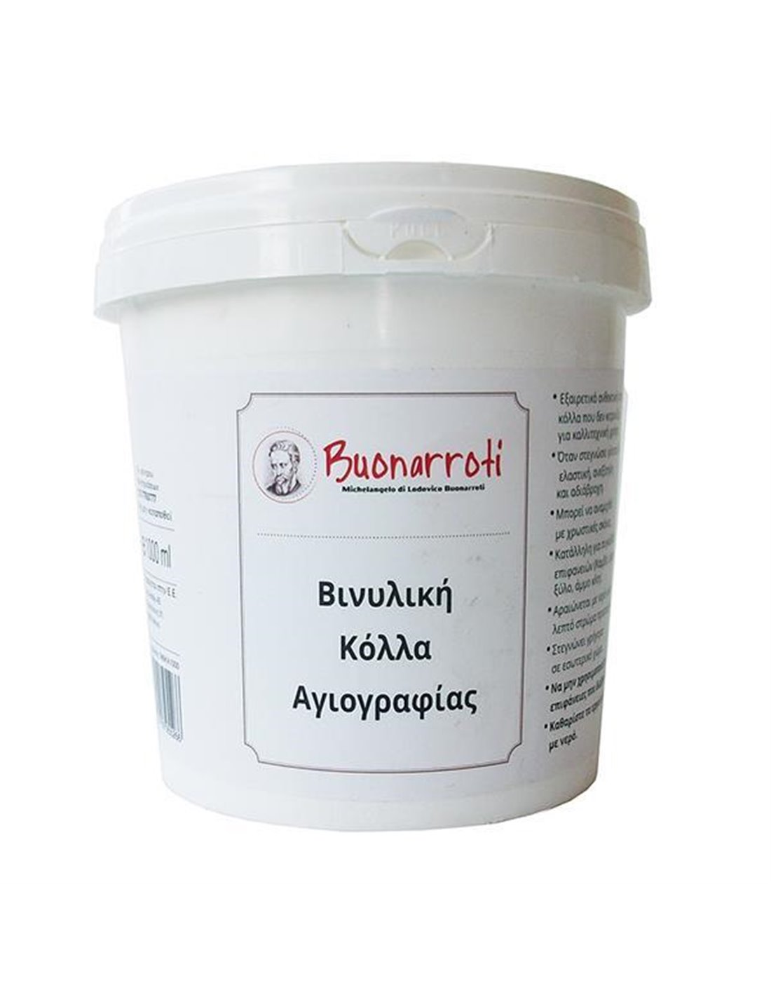 Buonarroti κόλλα αγιογραφίας 1000ml. Ακρυλική πρώτη ύλη που χρησιμοποιείται ως βάση- υλικό ανάμειξης για τις σκόνες αγιογραφίας, προκειμένου να δημιουργηθεί χρώμα αγιογραφίας σε παχύρευστη υγρή μορφή.