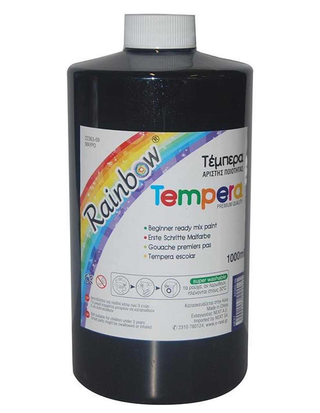 Τέμπερα μαύρη 1000ml σε μπουκάλι. Μη τοξικό προιόν. Τα ρούχα αν λερωθούν πλένονται στους 30°C.