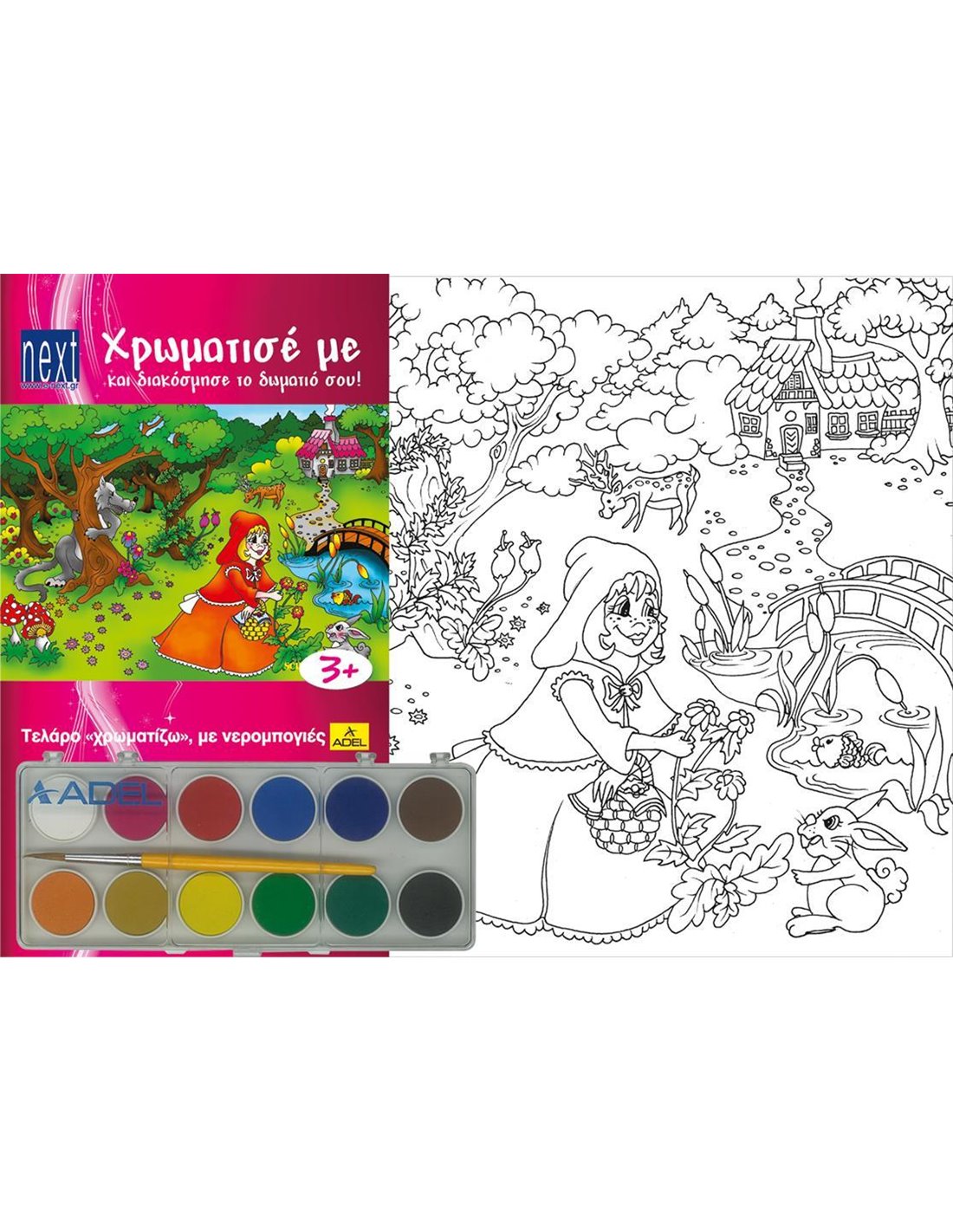 Κορνίζα (τελάρο) ζωγραφικής "Κοκκινοσκουφίτσα" με νερομπογιές ADEL. Η κορνίζα έχει εξωτέρικο χαρτί ακουαρέλας 230γρ. κατάλληλο για ζωγραφική με νερομπογιές. Επίσης εφόσον το παιδί χρωματίσει την κορνίζα μπορεί να την κρεμάσει στον τοίχο του δωματίου του για διακόσμηση. Διατίθεται σε 8 διαφορετικά σχέδια γνωστών παραμυθιών. Κατασκευάζεται στην Ελλάδα. Διαστάσεις: 25x35x2εκ.