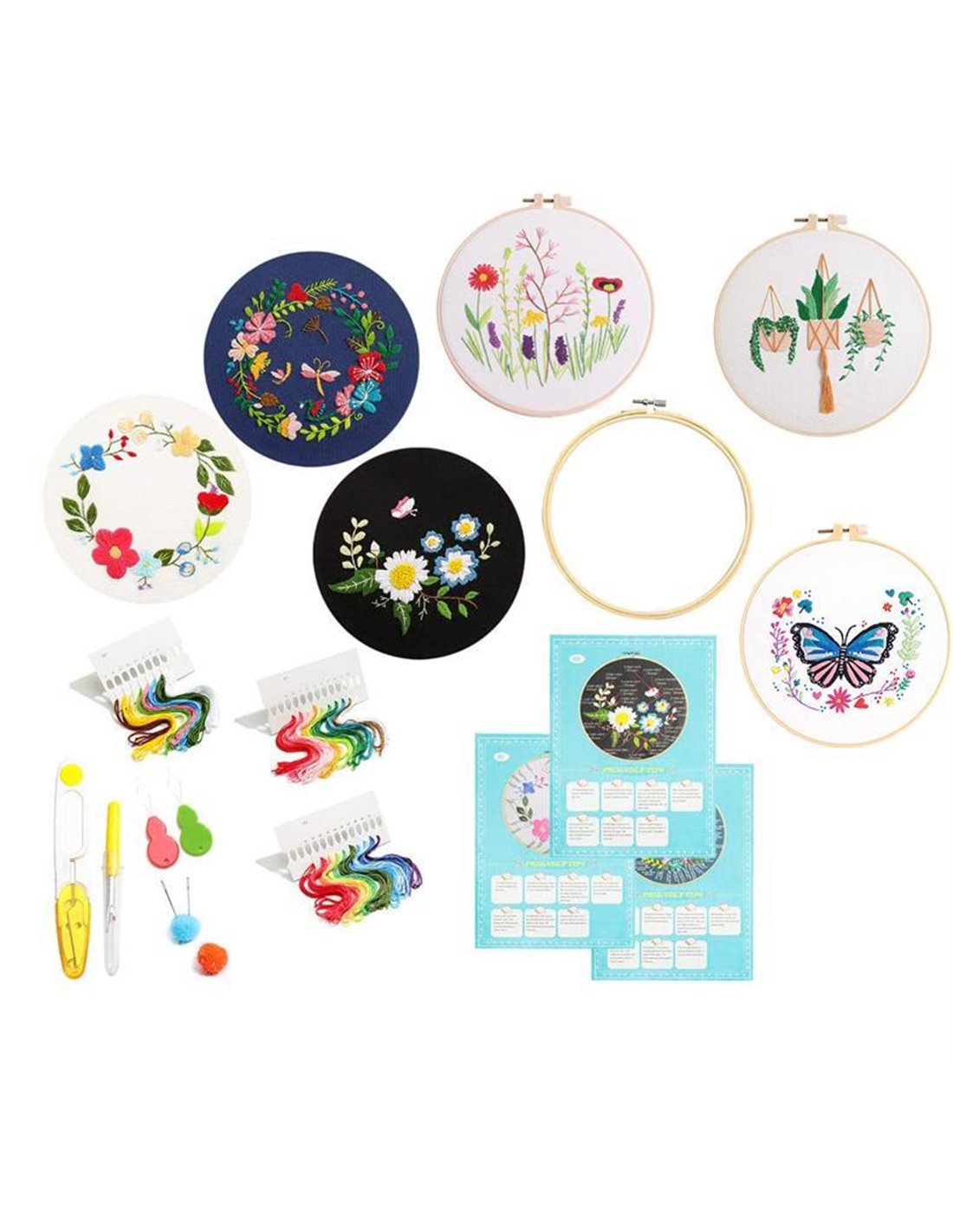 Το σετ περιλαμβάνει βελόνα, τελάρο κεντήματος, νήματα, και ύφασμα με σχέδιο κεντήματος.