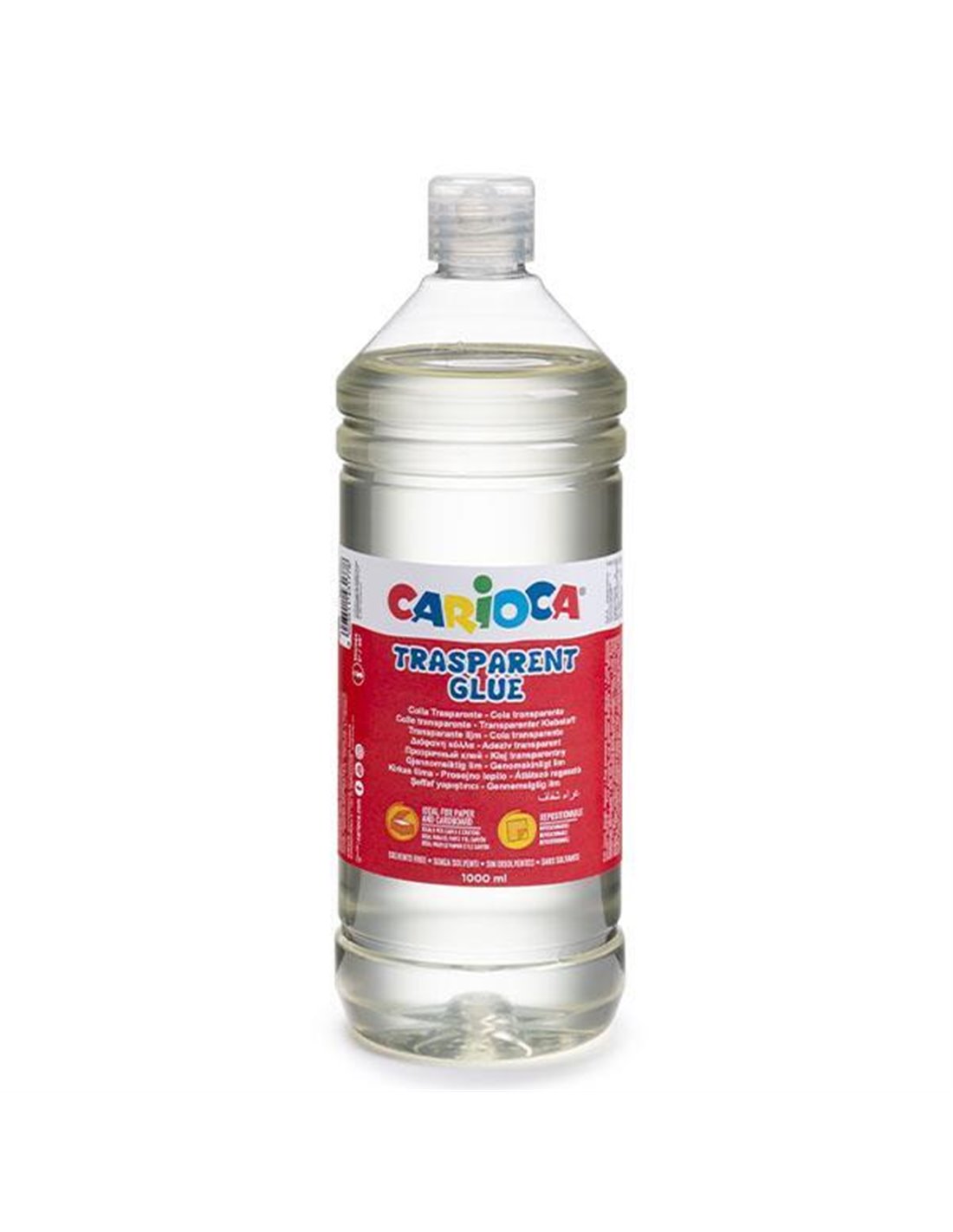 Carioca διάφανη κόλλα 1lit. Διαθέτει ειδικό στόμιο για εύκολη εφαρμογή. Είναι κατάλληλη για χαρτί και επιφάνειες από χαρτόνι, ενώ μόλις στεγνώσει γίνεται διάφανη. Δεν περιέχει διαλύτες.