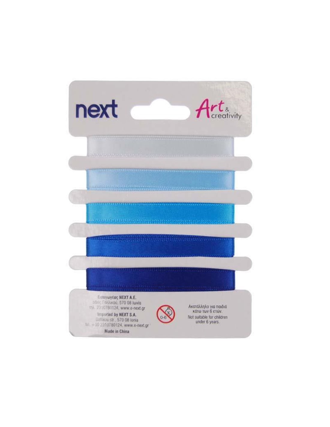 Κορδέλα σατέν σε blister, σε 5 αποχρώσεις του μπλε. Κάθε απόχρωση είναι 1 μέτρο. Κατάλληλη για χειροτεχνίας αλλά και διακόσμηση.