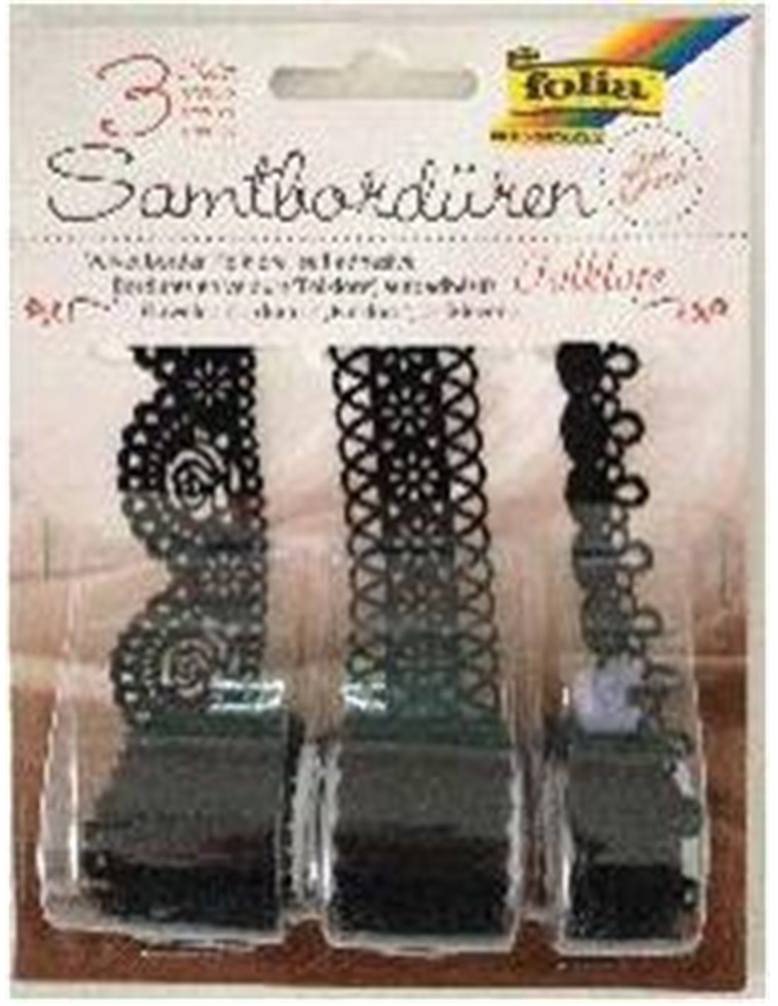 Δαντέλα από βελούδο. Σε 3 διαφορετικά σχέδια ανα blister. 1 μέτρο/ ρολό. Κατάλληλο για χειροτεχνίες - decoupage. Χρώμα: μαύρο.