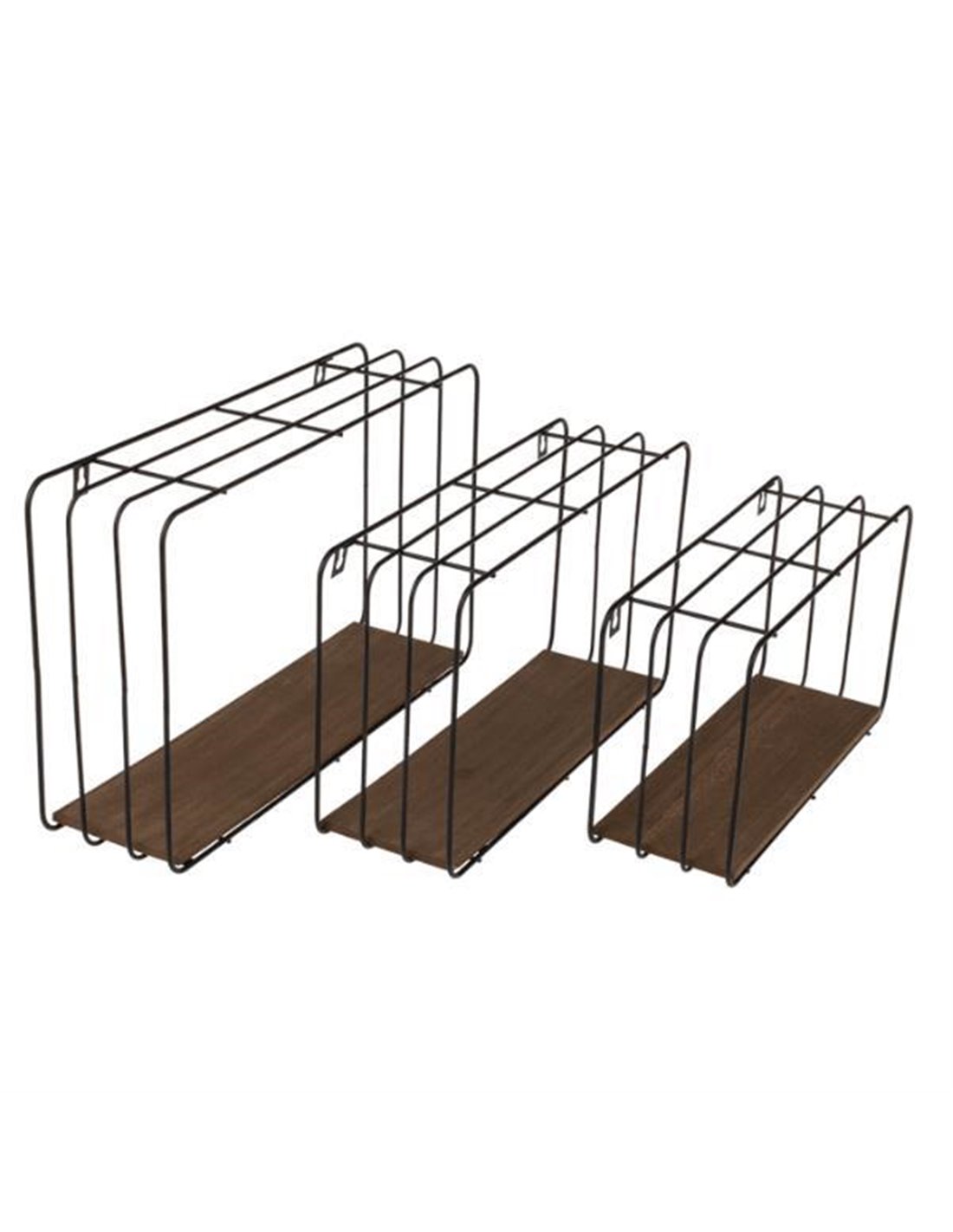 Σετ 3 επιτοίχια ράφια μεταλλικά με ξύλινη βάση. Σε μαύρο χρώμα. Κατάλληλο για το σαλόνι, την κουζίνα ή το γραφείο. Διαθέτουν οπές για ασφαλή στήριξη στον τοίχο. Αντέχουν βάρος 2,5 kg έκαστο. Διαστάσεις: 40xΥ24εκ., 34xΥ20εκ., 30xΥ17εκ.