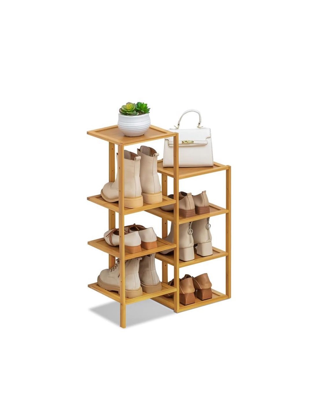 Διπλή παπουτσοθήκη Nextdeco από μπαμπού 8 θέσεων. Διαθέτει 4 ράφια σε κάθε πλευρά, προσφέροντας άφθονο χώρο αποθήκευσης για παπούτσια, φυτά ή διακοσμητικά αντικείμενα. Εύκολη στην εγκατάσταση με αναλυτικές οδηγίες και ρυθμιζόμενα ράφια για προσαρμογή της διάταξης ανάλογα με τις ανάγκες σας. Ιδανική για εισόδους, σαλόνια, υπνοδωμάτια ή ακόμη και μπαλκόνια. Διαστάσεις: Υ44x70x27εκ.