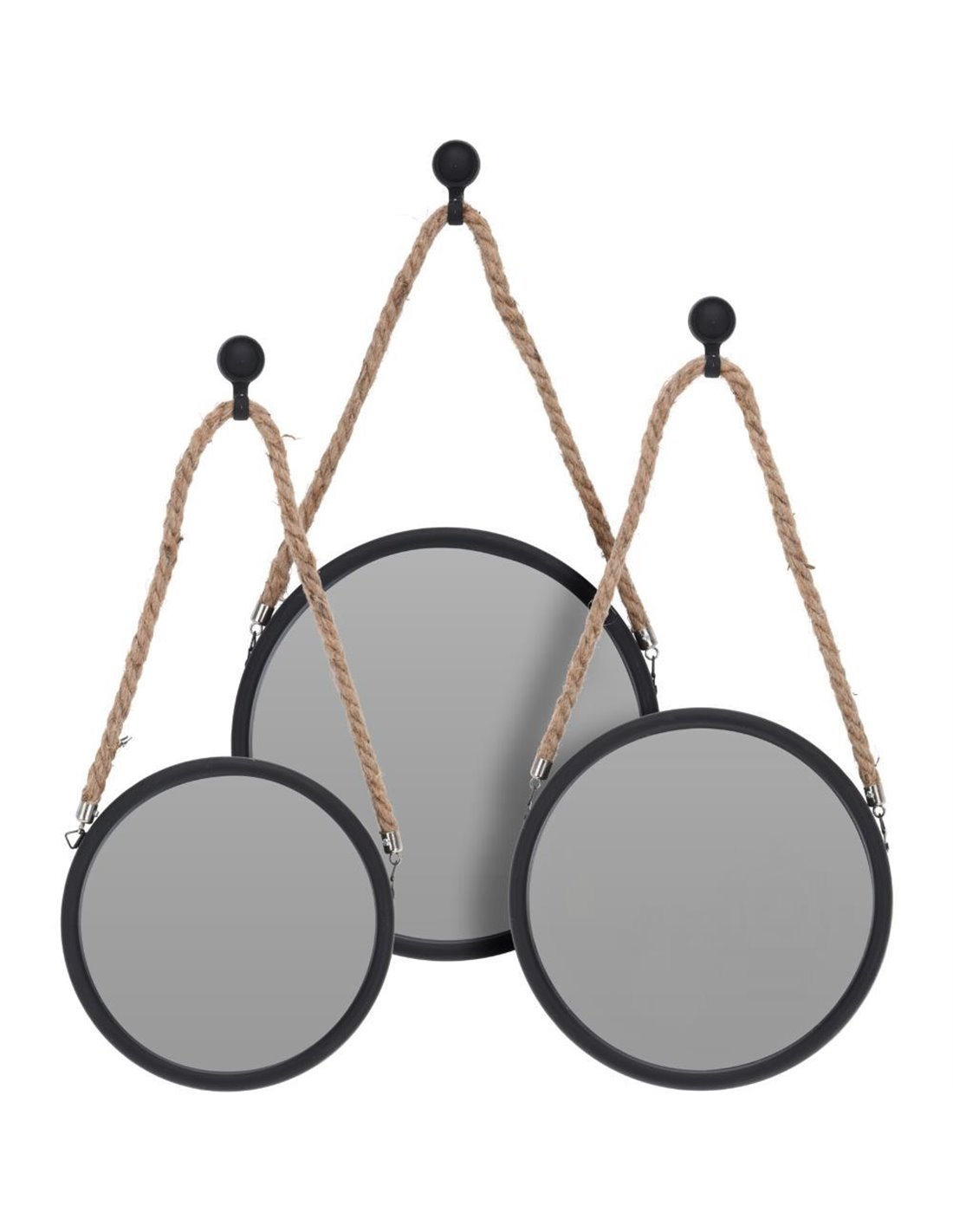 Σετ 3 τεμάχια καθρέφτες τοίχου στρογγυλοί μαύροι. Σε μοντέρνο στυλ, έχουν σχοινάκι και γαντζάκια για την ανάρτηση σε τοίχο, ενώ μπορούν να τοποθετηθούν στο χώρο με διάφορους τρόπους. Αποτελούν μια όμορφη και κλασική επιλογή, για τη διακόσμηση του σπιτιού. Το σετ αποτελείται από: 1 καθρέπτη διαμέτρου 22,8εκ ., 1 καθρέπτη διαμέτρου 20,3εκ., και 1 καθρέπτη διαμέτρου 17,8εκ. Χρήσιμη συμβουλή: Καθαρίζονται με νωπό πανί και νερό.