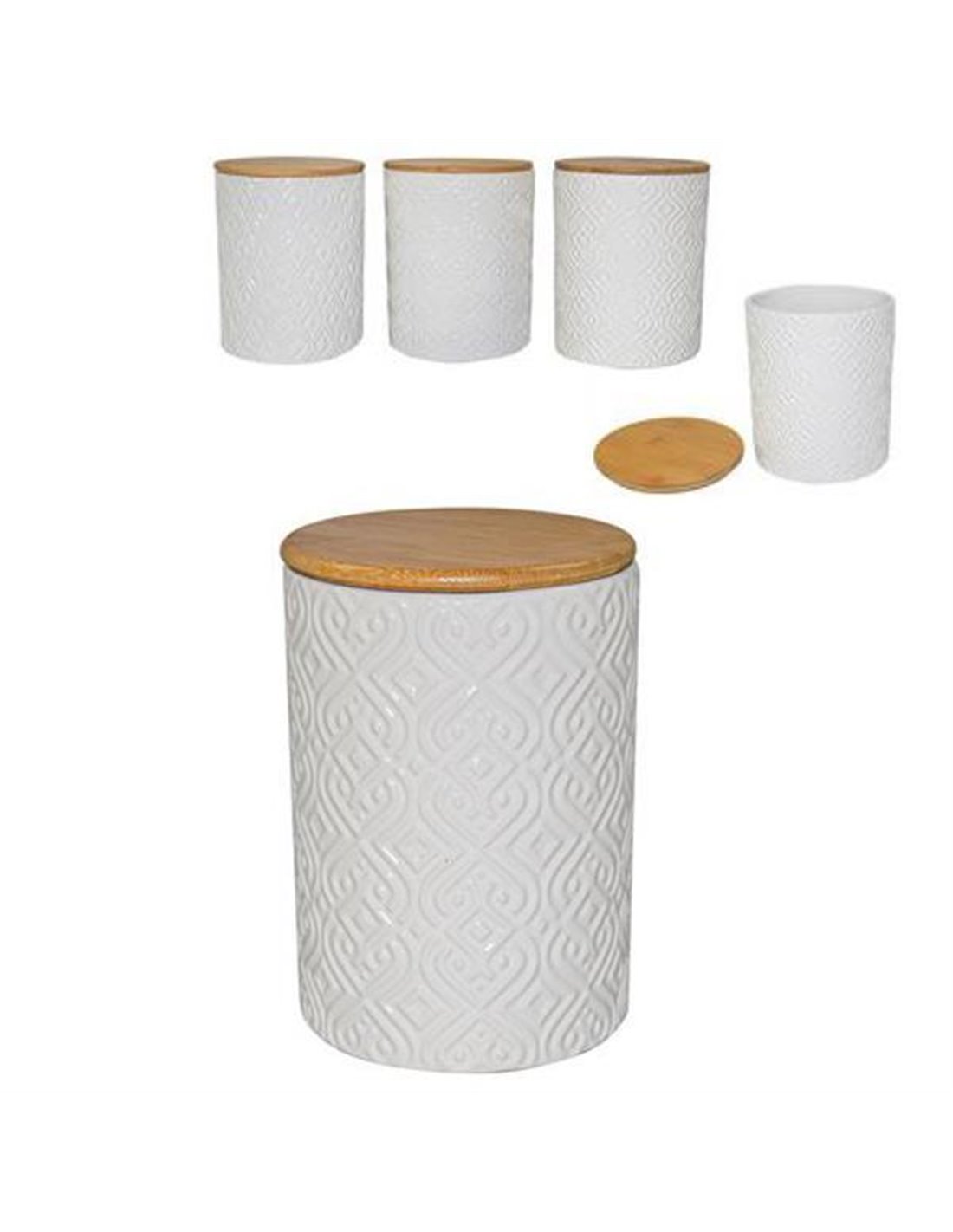 Βαζάκι κεραμικό με καπάκι μπαμπού. Διατίθεται σε 3 διαφορετικά ανάγλυφα σχέδια. Τυχαία επιλογή σχεδίου. Διαστάσεις: Υ15,5x11εκ.