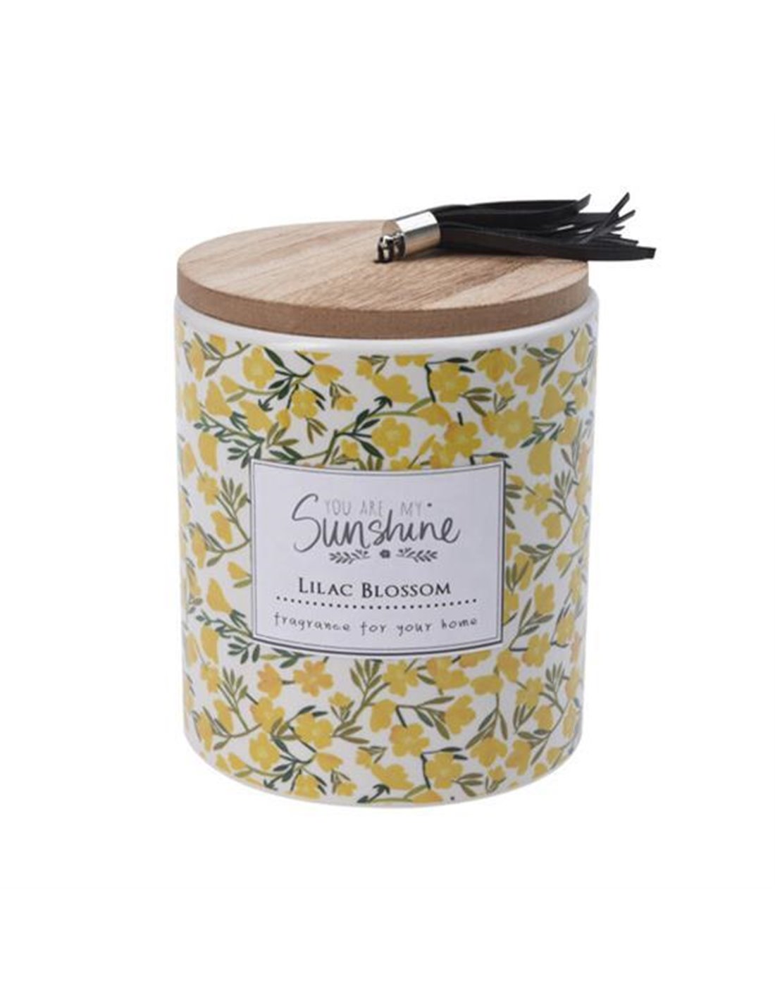Αρωματικό κερί "Sunshine" σε κεραμικό βαζάκι με ξύλινο καπάκι και φούντα. Διαστάσεις Ø9x11,7εκ.