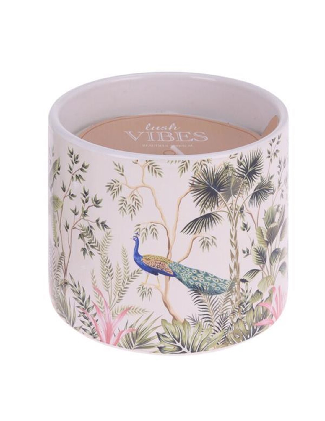 Κερί αρωματικό 180gr. σε κεραμικό βαζάκι με τροπικά σχέδια. Χρώμα κεριού κρεμ- λευκό. Διαστάσεις: Ø10,4xY8,5εκ.