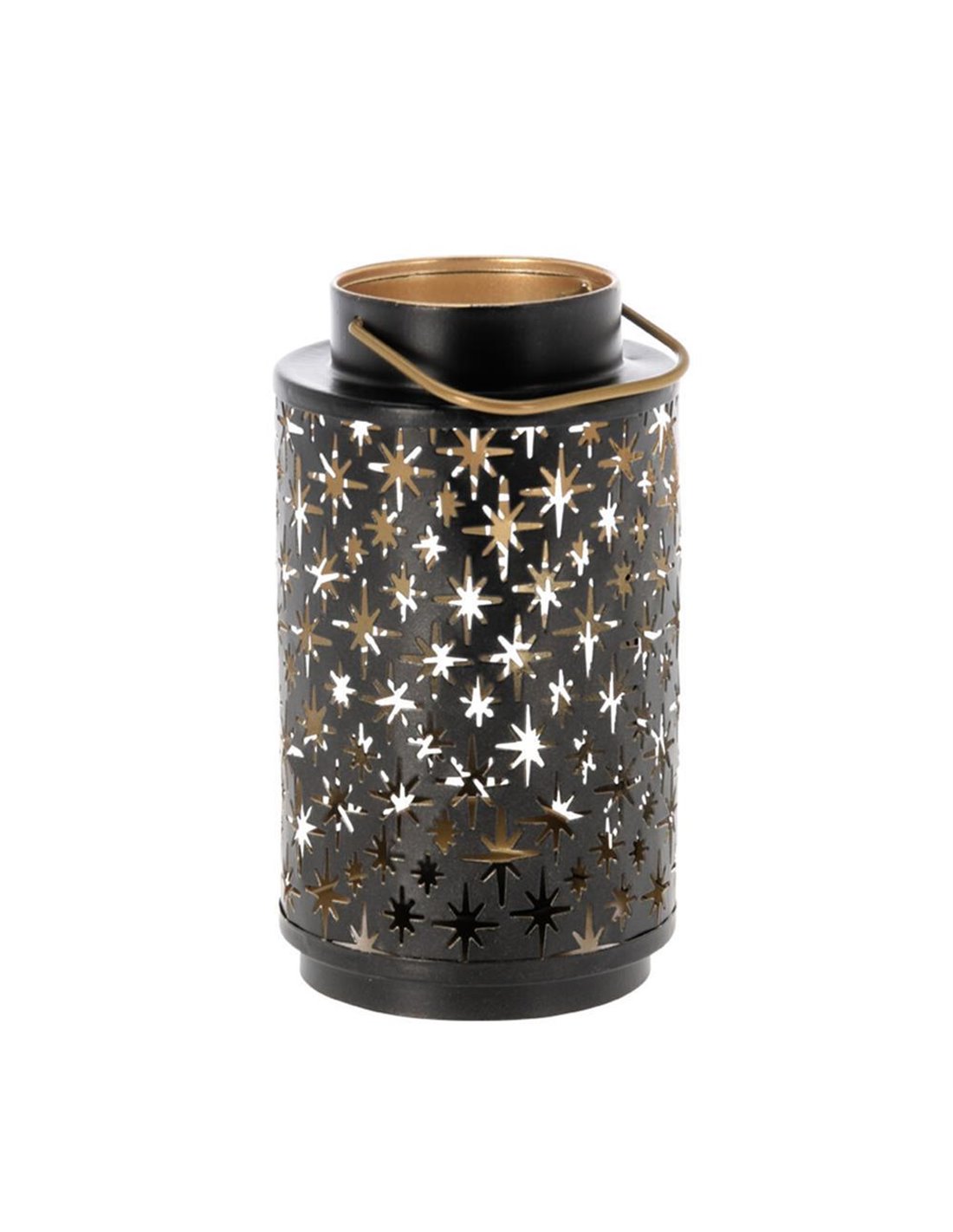 Μεταλλικό φανάρι για κερί σε κομψό μαύρο εξωτερικά και χρυσαφί εσωτερικά, ύψους 16 εκ. και διαμέτρου 9,4 εκ. Το εκλεπτυσμένο χρώμα του εσωτερικού αντανακλά το φως του κεριού, δημιουργώντας μια ζεστή και πολυτελή ατμόσφαιρα στον χώρο σας. Ιδανικό για χρήση τόσο σε εσωτερικούς όσο και σε εξωτερικούς χώρους.