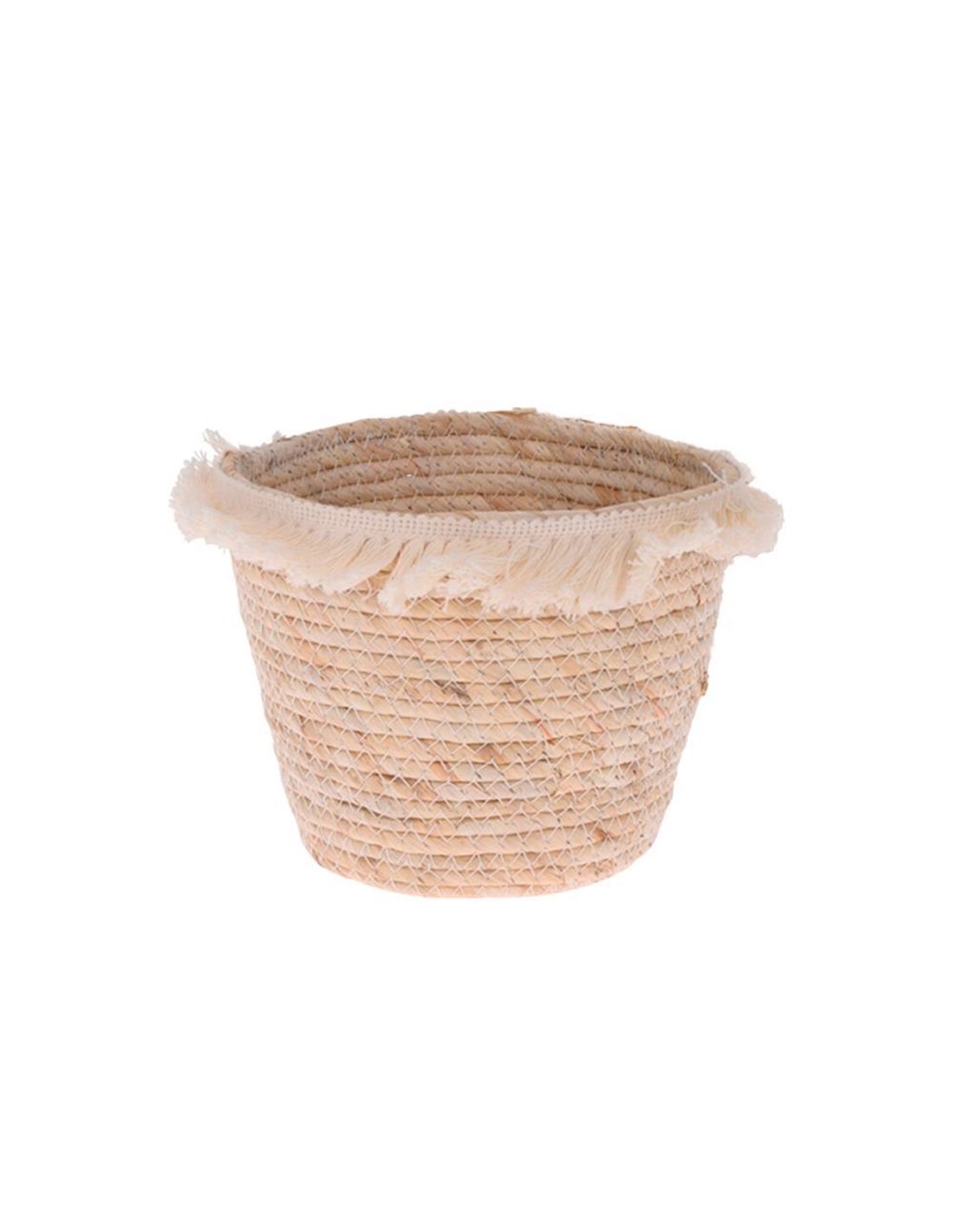 Καλάθι αποθήκευσης μικρό σε εκρού χρώμα με διακοσμητικά κρόσσια. Ιδανικό για να κρατήσει οργανωμένα τα μικροαντικείμενα, τα περιοδικά και ότι άλλο φανταστείτε, δίνοντας παράλληλα μια φρέσκια ανάσα στο χώρο σας. Διαστάσεις: Υ16.5x Ø21εκ.