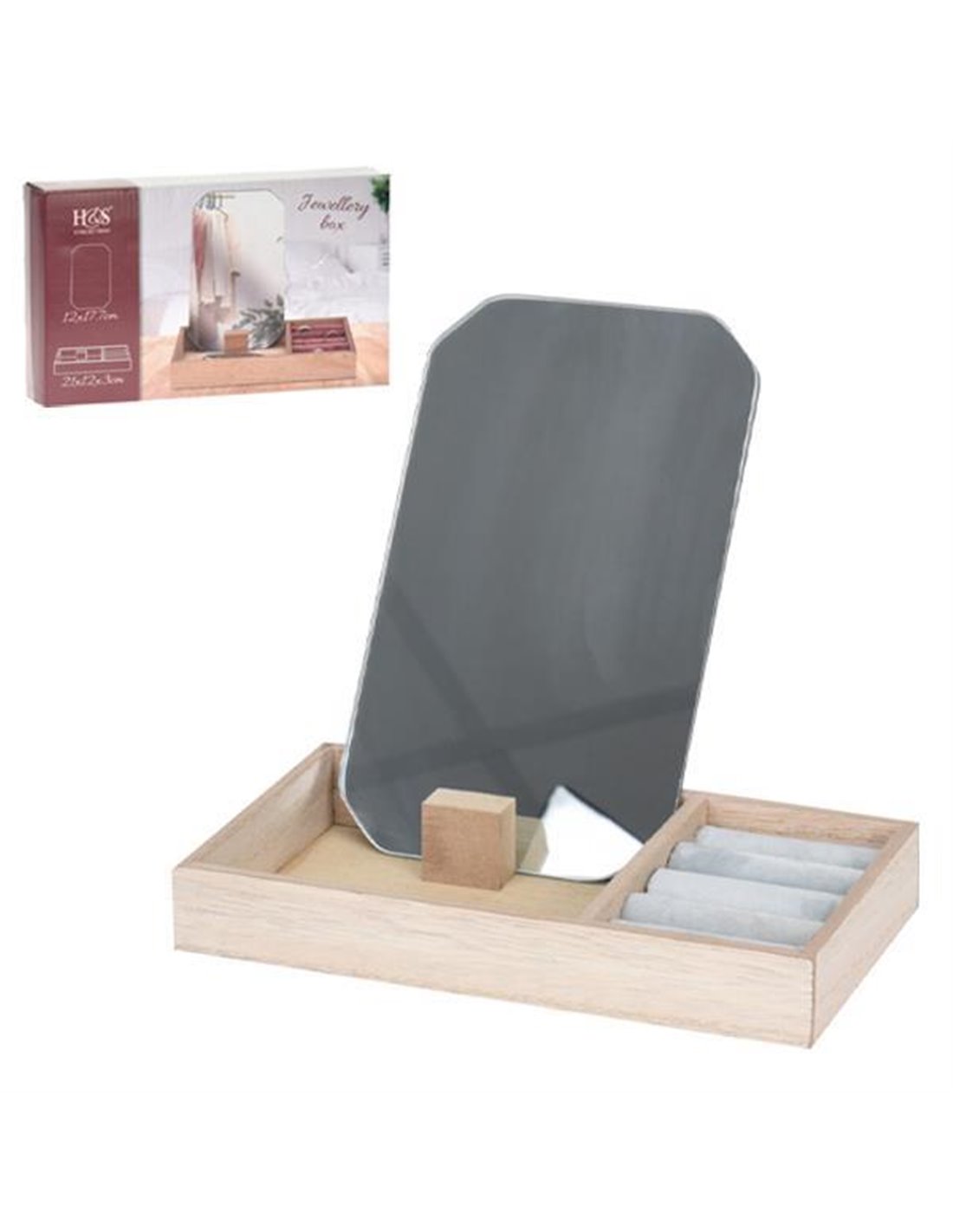 Μπιζουτιέρα με ξύλινο δίσκο με βελούδινη επένδυση και καθρέφτη. Ιδανική για την τακτοποίηση και την οργάνωση των κοσμημάτων και των αξεσουάρ σας. Διαστάσεις καθρέφτη: 12x17,7εκ. Διαστάσεις δίσκου: 21x12xY3εκ. Διαστάσεις συσκευασίας: 22,5x16x4εκ.