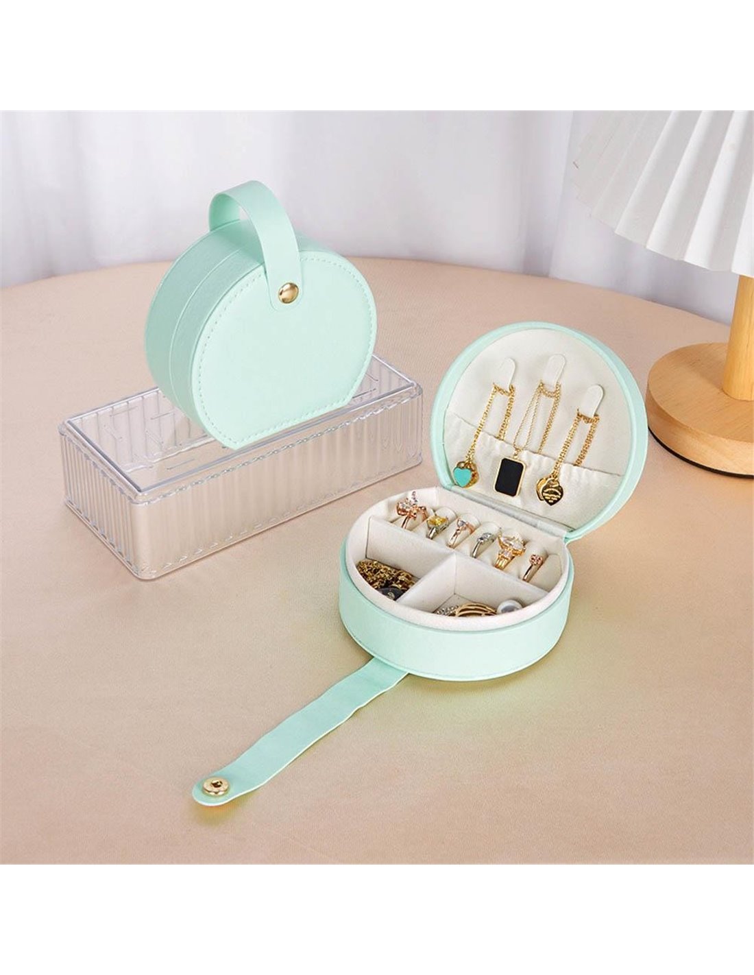 Μικρή και πρακτική στρόγγυλη γαλάζια θήκη κοσμημάτων με μοντέρνο λουράκι κουμπώματος. Ιδανική για ταξίδια, δώρα ή καθημερινή αποθήκευση κοσμημάτων στο σπίτι.