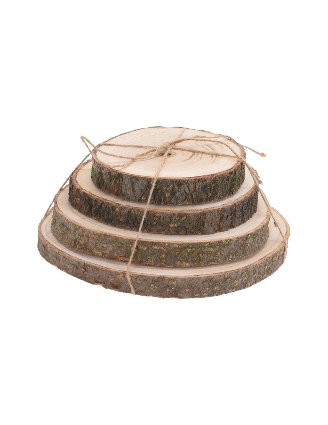 Σετ 4 ξύλινες φέτες κορμού με φυσικό φλοιό, κατασκευασμένες από ξύλο paulownia. Οι φέτες έχουν διάμετρο από 14 έως 20 εκ. και είναι δεμένες με σχοινί γιούτας. Ιδανικές για διακόσμηση, χειροτεχνίες, κεριά ή rustic στολισμό τραπεζιού.