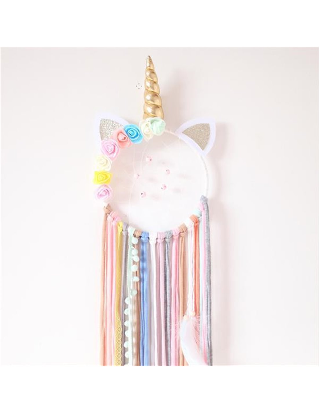 Διακοσμητικό επιτοίχιο με μονόκερο για το βρεφικό ή παιδικό δωμάτιο. Με μεταλλικό κρίκο και πολύχρωμες κορδέλες. Διαστάσεις: 19x95εκ.