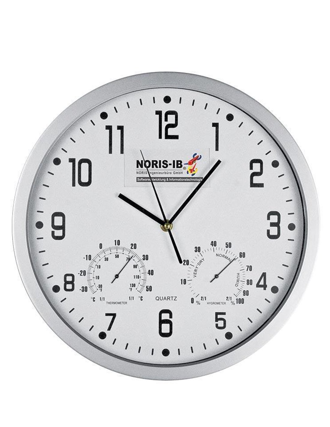 Ρολόι τοίχου με υγρόμετρο και θερμόμετρο με λευκό καντράν Ø35εκ. Μπορεί να χρησιμοποιηθεί και σαν διαφημιστικό δώρο με αποσπώμενο χώρο εκτύπωσης.