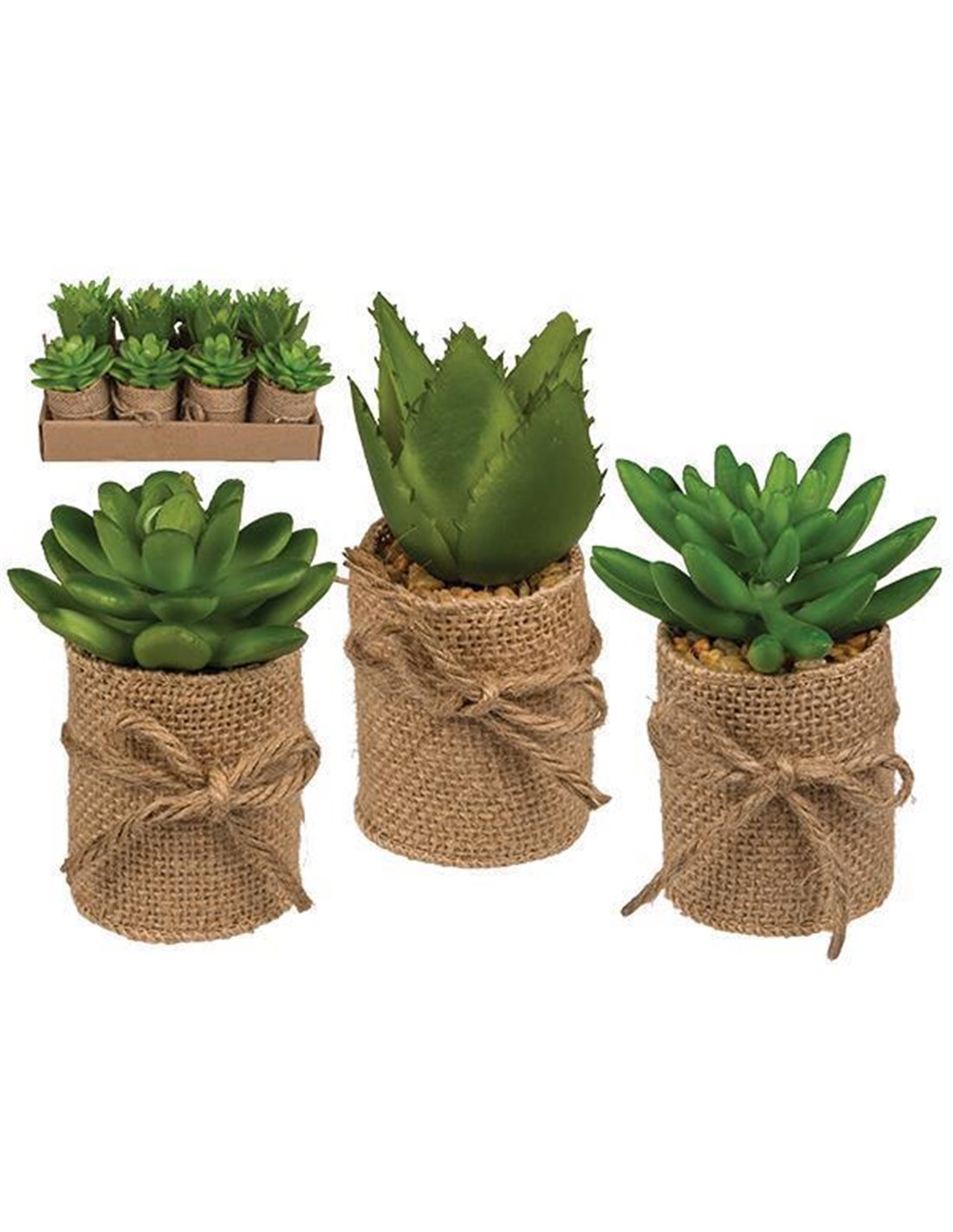 Τεχνητά παχύφυτα σε γλαστράκι από λινάτσα. Τρία διαφορετικά σχέδια. Τυχαία επιλογή φυτού Διαστάσεις: Υ10x5εκ.