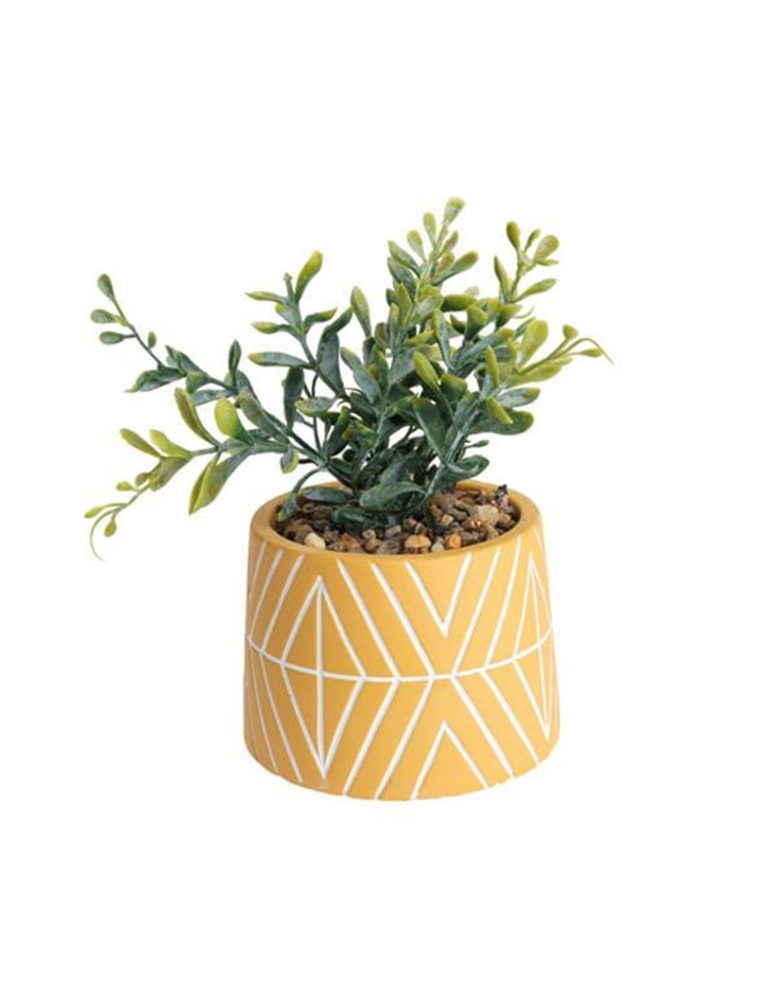 Γλαστράκι κεραμικό, κίτρινο, με τεχνητό φυτό το οποίο μοιάζει σαν αληθινό.