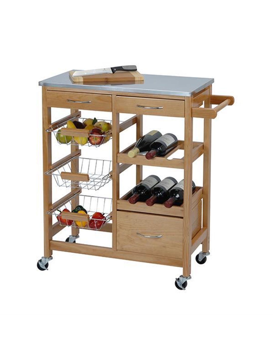 Τρόλεϊ κουζίνας από ξύλο πεύκου σε σκούρο χρώμα με ανοξείδωτη επιφάνεια. Διαθέτει 3 μεταλλικά καλάθια χρωμίου μεγέθους 19x18xΥ7εκ., 2 συρτάρια μεγέθους 19x18xΒ7εκ., 1 μεγάλο συρτάρι 19x18xΒ17εκ., 2 σχάρες κρασιού 32,4x19xΥ4εκ. και ένα χερούλι. Περιλαμβάνει επίσης 4 ροδάκια, τα 2 με στοπ ώστε να μπορείτε να το σύρετε ή να το μετακινείτε όπου θέλετε.
