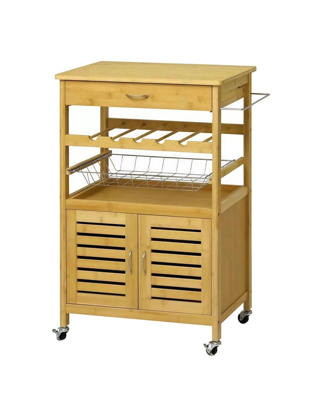 Τρόλεϊ κουζίνας από μπαμπού το οποίο διαθέτει ένα ντουλάπι με 2 πορτάκια, μια κρεμάστρα για πετσέτες με γυαλιστερό φινίρισμα, ένα συρτάρι, ένα μεταλλικό ματ γκρι καλάθι και 5 θήκες για μπουκάλια. Περιλαμβάνει επίσης 4 ροδάκια, τα 2 με στοπ ώστε να μπορείτε να το σύρετε ή να το μετακινείτε όπου θέλετε. Διαστάσεις: 60x36xΥ88εκ. Βάρος: 9,8kg. Διαστάσεις κουτιού: Υ18x93x40,5εκ.