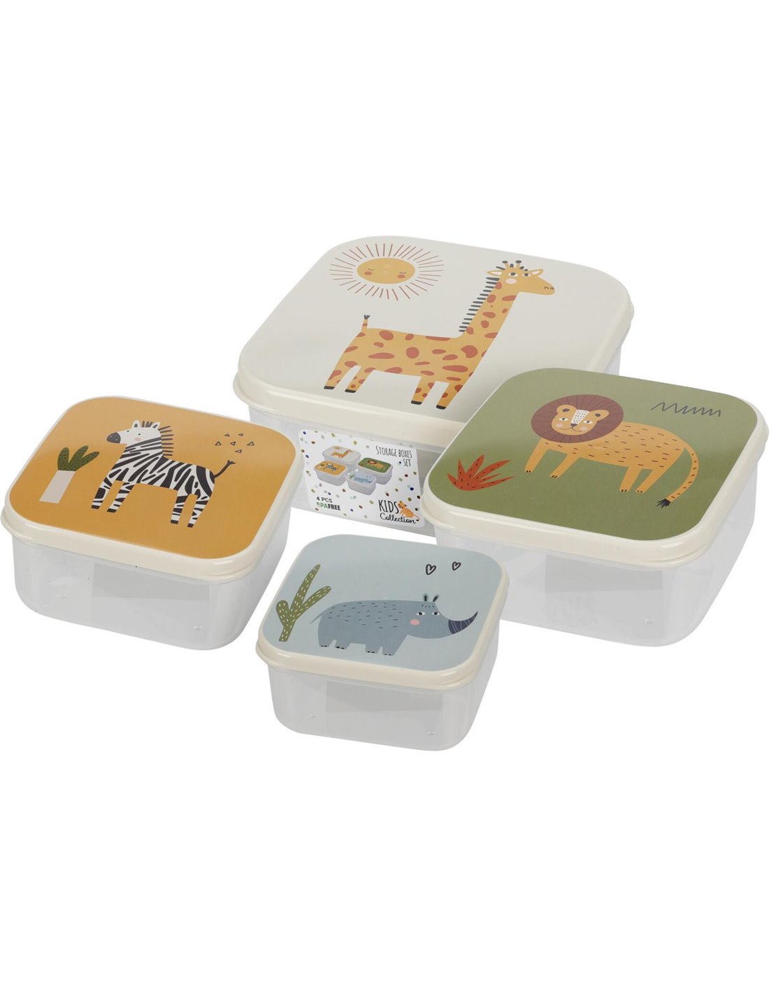 Φαγητοδοχεία σετ 4 τεμαχίων. Με 4 διαφορετικά σχέδια (καμηλοπάρδαλη 1l, λιοντάρι 650ml, ζέβρα 450ml και ρινόκερος 300ml.) Διαθέτει εύχρηστο σχήμα, καταλαμβάνει λίγο χώρο, διαθέτει όμως αρκετό για τα σάντουιτς, τις σαλάτες ή τα φρούτα σας. Διαστάσεις: Υ6,5x14x14εκ.