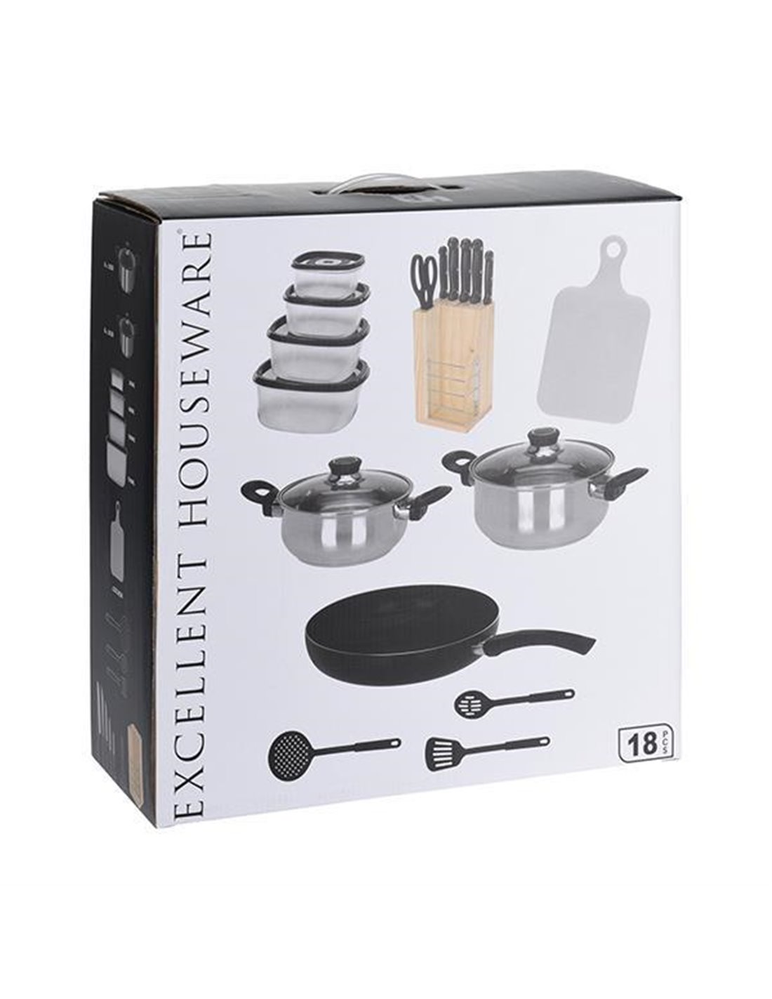 Περιλαμβάνει: 2 ανοξείδωτες κατσαρόλες Ø18εκ. - Ø20εκ., 1 τηγάνι Ø24εκ. 3 κουτάλες, 5 ανοξείδωτα μαχαίρια, 1 ψαλίδι, 1 ξύλινη βάση για τα μαχαίρια, 1 συνθετική σανίδα κοπής διαστάσεων 32x18x0,8εκ. και 4 δοχεία τροφίμων.