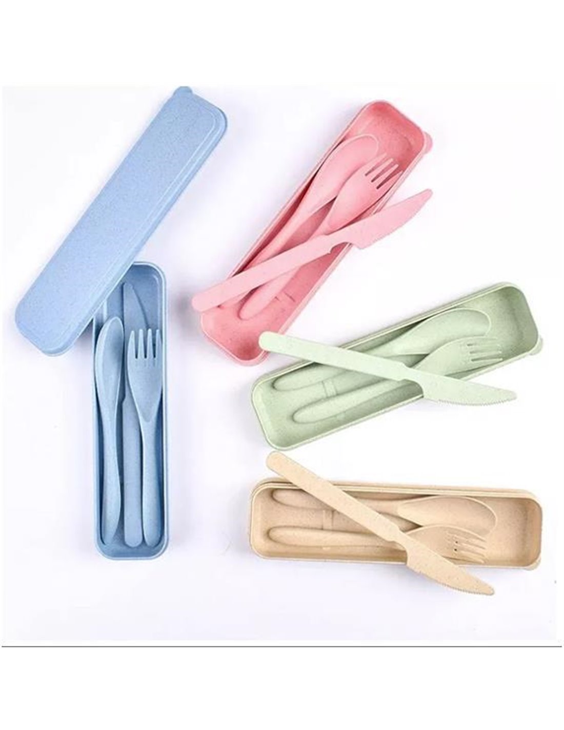 Σετ μαχαιροπήρουνα σε θήκη. Διαστάσεις: κουτάλι 15,5x3εκ., πιρούνι 15x2,5εκ., μαχαίρι 18x1,5εκ. Χρώματα: μπεζ, πράσινο, μπλε και ροζ.