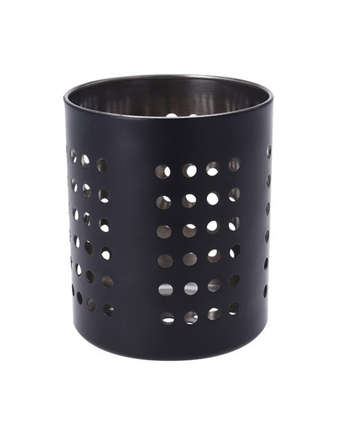 Θήκη για μαχαιροπήρουνα, ανοξείδωτη (201), με τρύπες και μαύρο ματ φινίρισμα. Διαστάσεις: Ø10,5xΥ13,1εκ. Βάρος 160γρ.