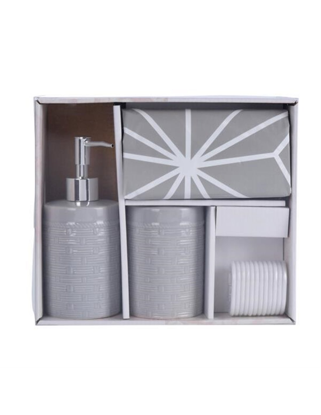 Το σετ περιλαμβάνει ένα dispenser υγρού σαπουνιού, μια θήκη για οδοντόβουρτσες