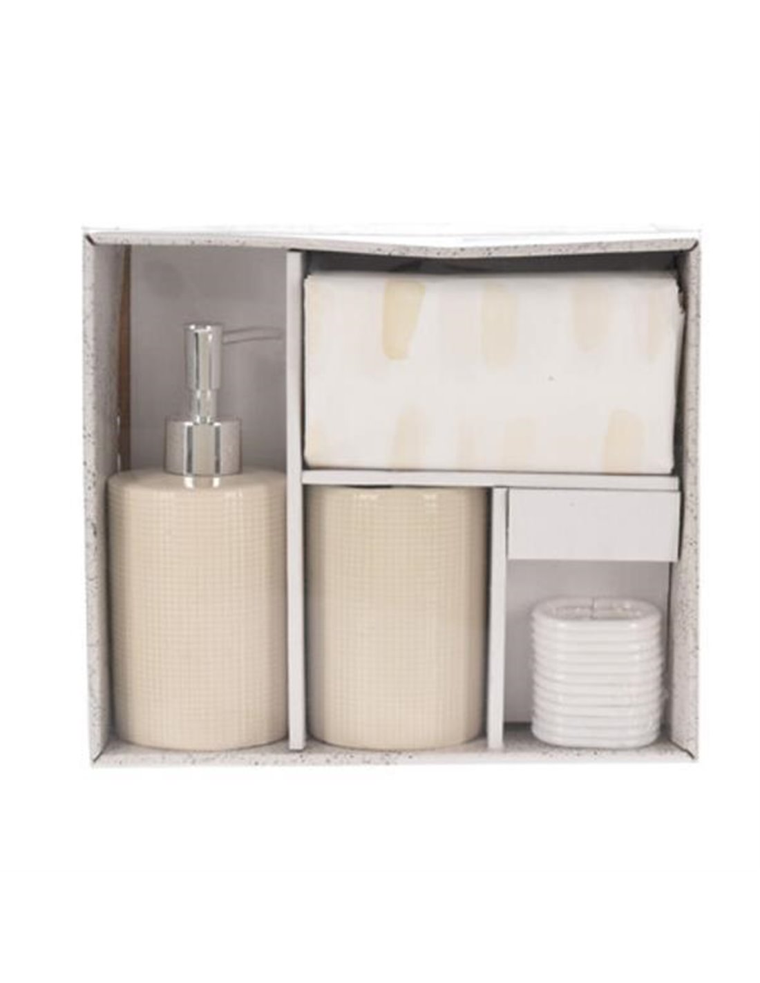 Σετ 3 τεμαχίων με αξεσουάρ μπάνιου. Το σετ περιλαμβάνει ένα dispenser υγρού σαπουνιού, μια θήκη για οδοντόβουρτσες και μια κουρτίνα μπάνιου διαστάσεων 180x180εκ, με 12 κρίκους. Διατίθεται σε πρακτική συσκευασία, κατάλληλη και για δώρο. Διαστάσεις συσκευασίας: Υ8,5x25x22εκ.