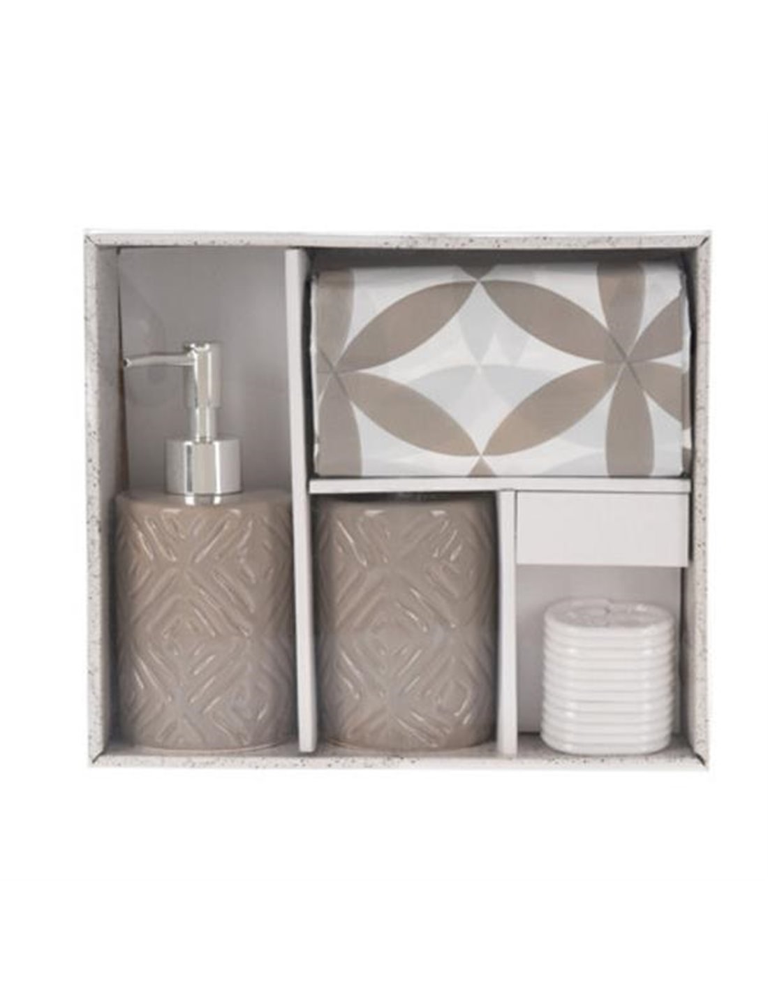 Σετ 3 τεμαχίων με αξεσουάρ μπάνιου. Το σετ περιλαμβάνει ένα dispenser υγρού σαπουνιού, μια θήκη για οδοντόβουρτσες και μια κουρτίνα μπάνιου διαστάσεων 180x180εκ, με 12 κρίκους. Διατίθεται σε πρακτική συσκευασία, κατάλληλη και για δώρο. Διαστάσεις συσκευασίας: Υ8,5x25x22εκ.