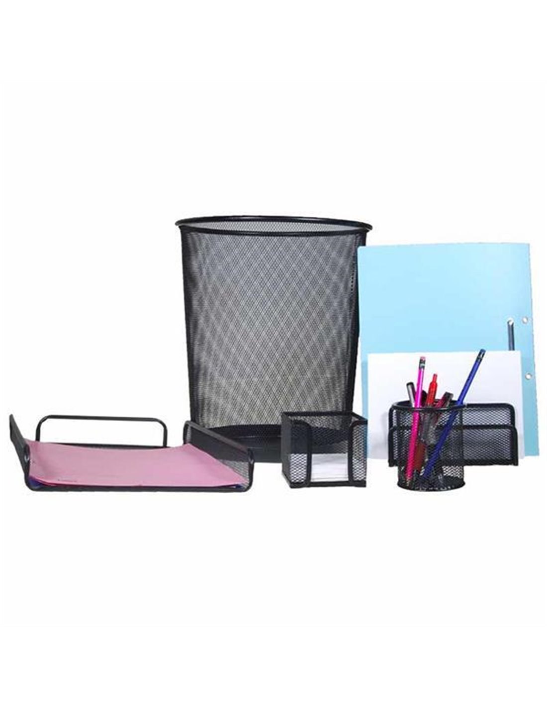 Σετ γραφείου μαύρο 5 τεμαχίων. Περιλαμβάνει:Δίσκο εγγράφων. Μολυβοθήκη. Κύβο σημειώσεων, Χαρτοθέτη. Καλάθι αχρήστων.