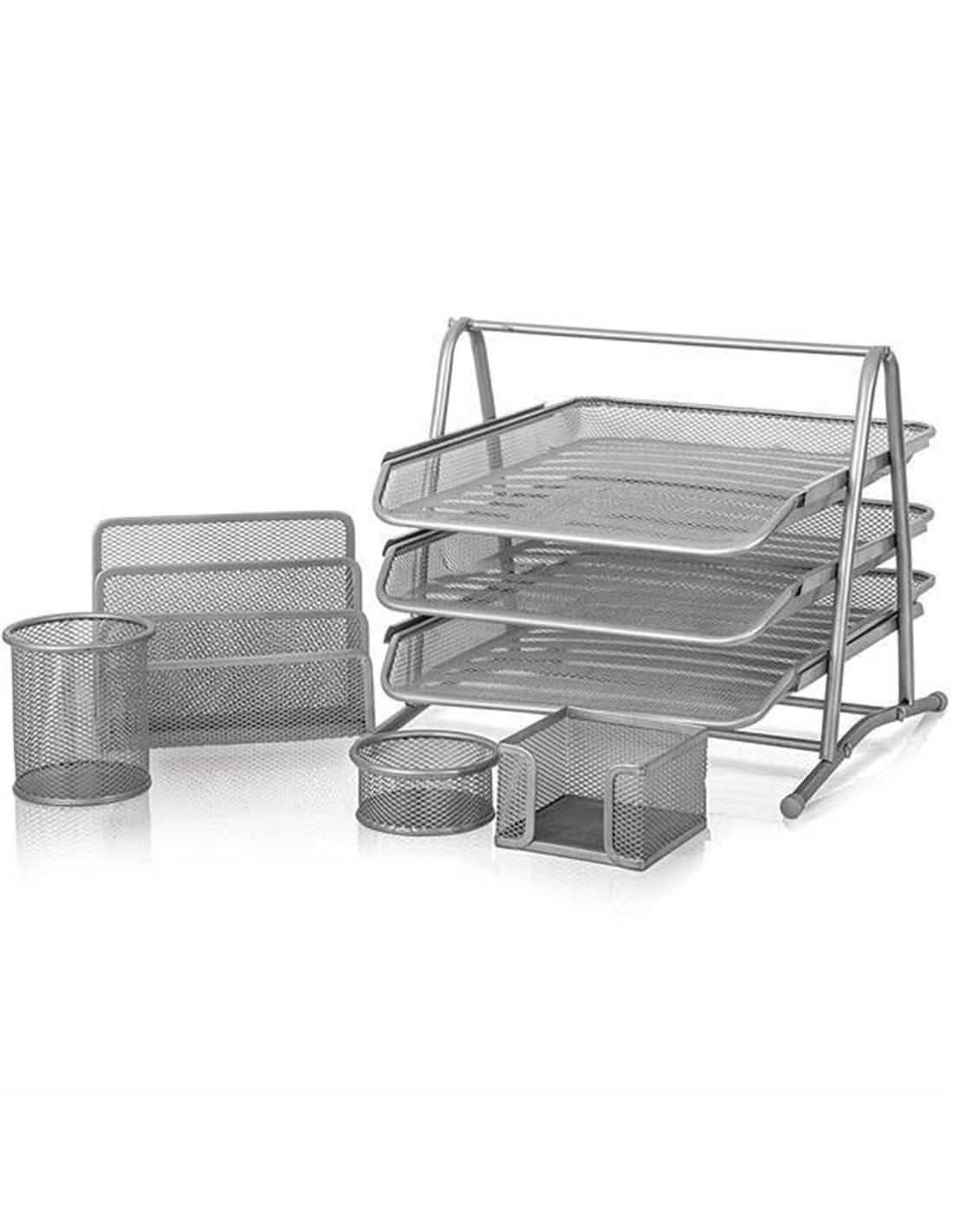 Σετ γραφείου ασημί 5 τεμαχίων. Περιλαμβάνει:Δίσκο εγγράφων. Μολυβοθήκη, Κύβο σημειώσεων. Χαρτοθέτη. Θήκη συνδετήρων.