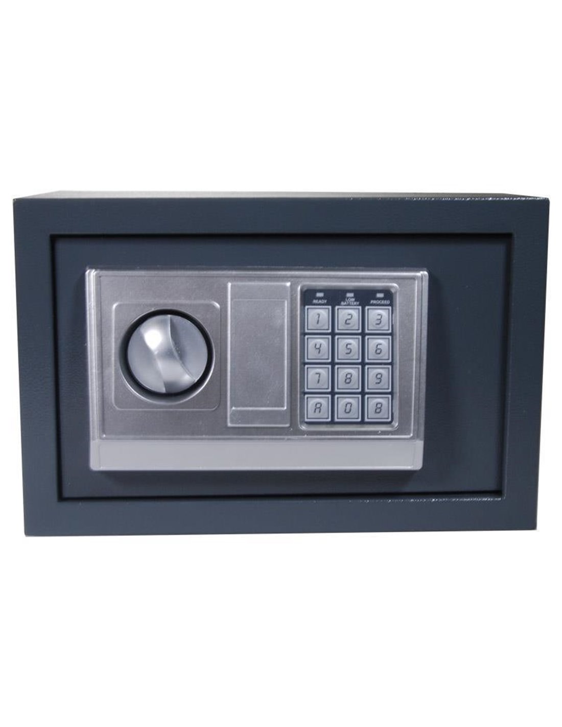 Χρηματοκιβώτιο με κλειδιά ασφαλείας και συνδυασμό. Κατάλληλο για ξενοδοχεία, ενοικιαζόμενα δωμάτια κ.α. Μπορεί να πακτωθεί στον τοίχο. Διαστάσεις: Υ20x31x20εκ. βάθος Χρώμα: γκρι.
