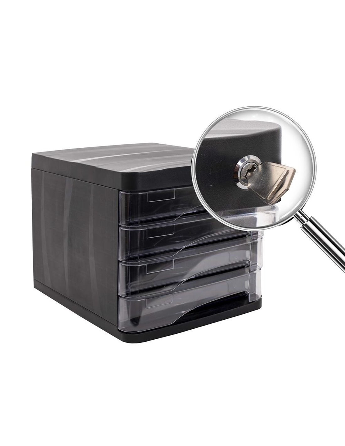 Με 4 διάφανα συρτάρια και κλειδαριά και κλειδί.