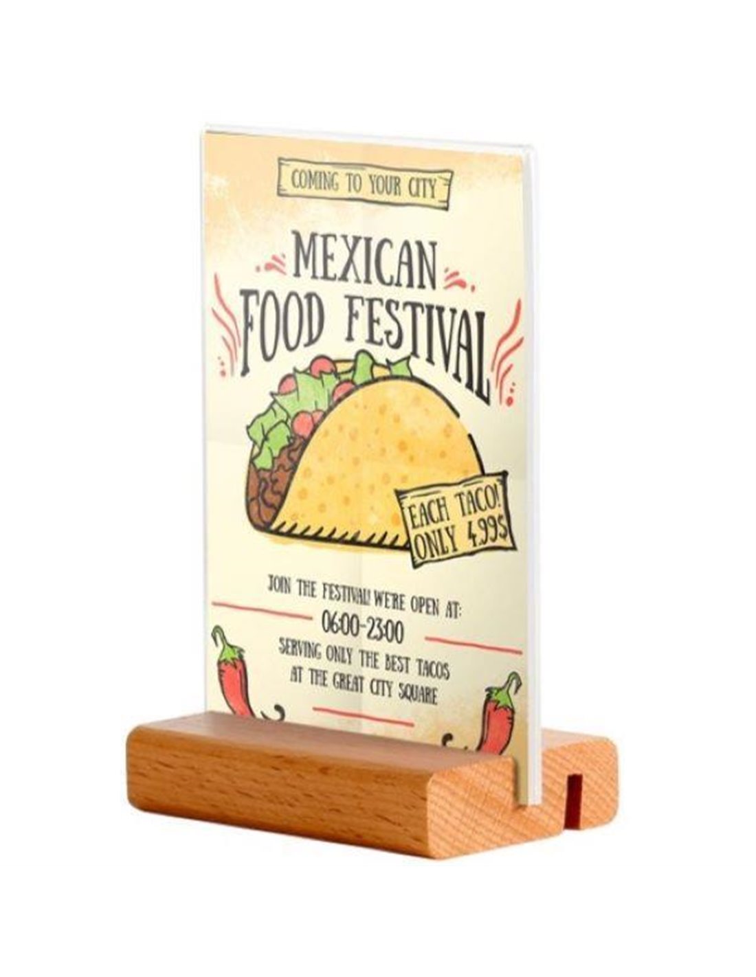 Επιτραπέζια ξύλινη βάση για μενού ή επιγραφές, δύο θέσεων, σε γωνία 90° ή 75°. Με ακρυλική θήκη δύο όψεων 14x21εκ. Κατάλληλη για εσωτερικούς και εξωτερικούς χώρους όπως καταστήματα, εστιατόρια, καφέ και μπαρ. Πλάτος: 6εκ.