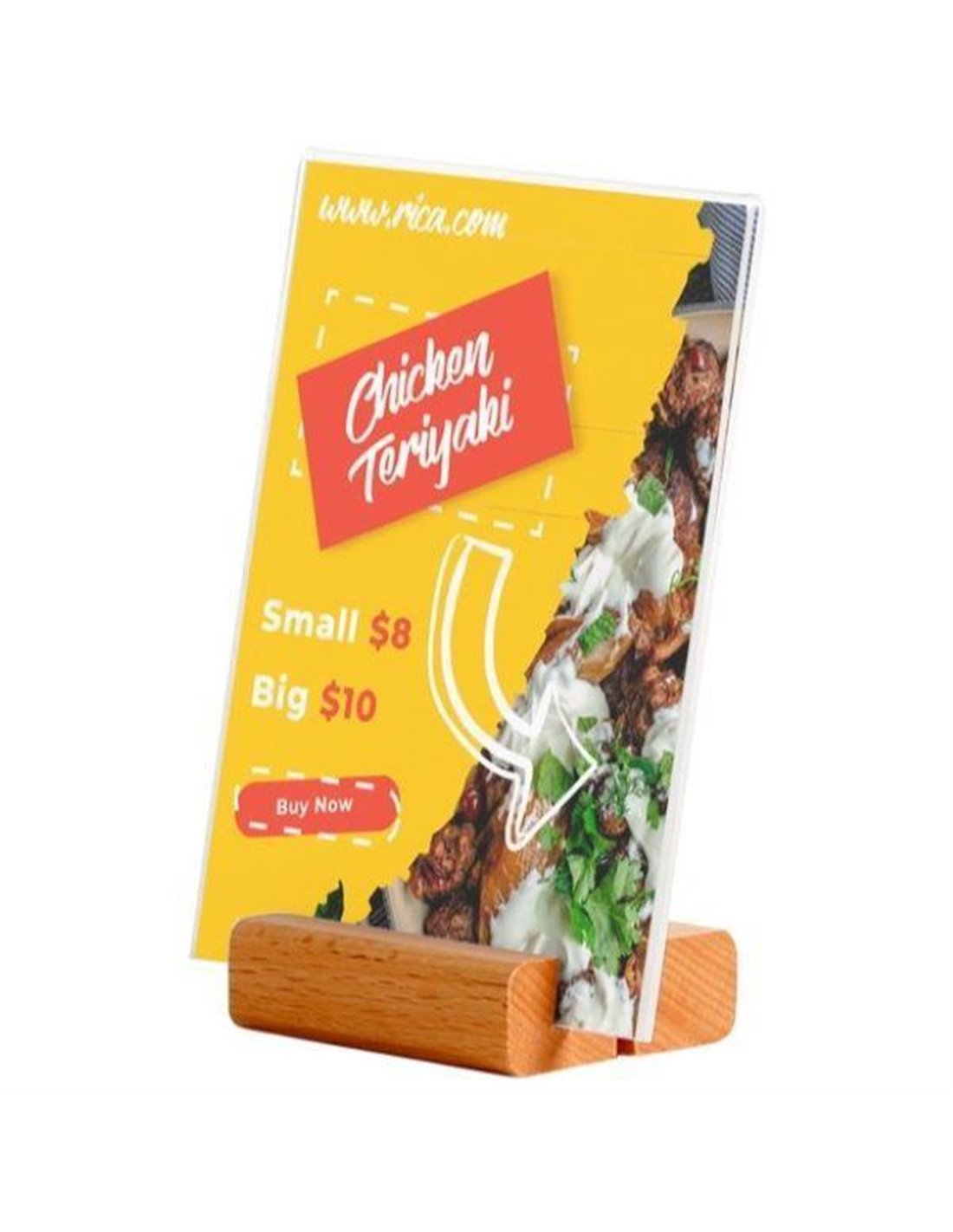 Επιτραπέζια ξύλινη βάση για μενού ή επιγραφές, δύο θέσεων, σε γωνία 90° ή 75°. Με ακρυλική θήκη δύο όψεων 7x14,8εκ. Κατάλληλη για εσωτερικούς και εξωτερικούς χώρους όπως καταστήματα, εστιατόρια, καφέ και μπαρ. Πλάτος: 6εκ.