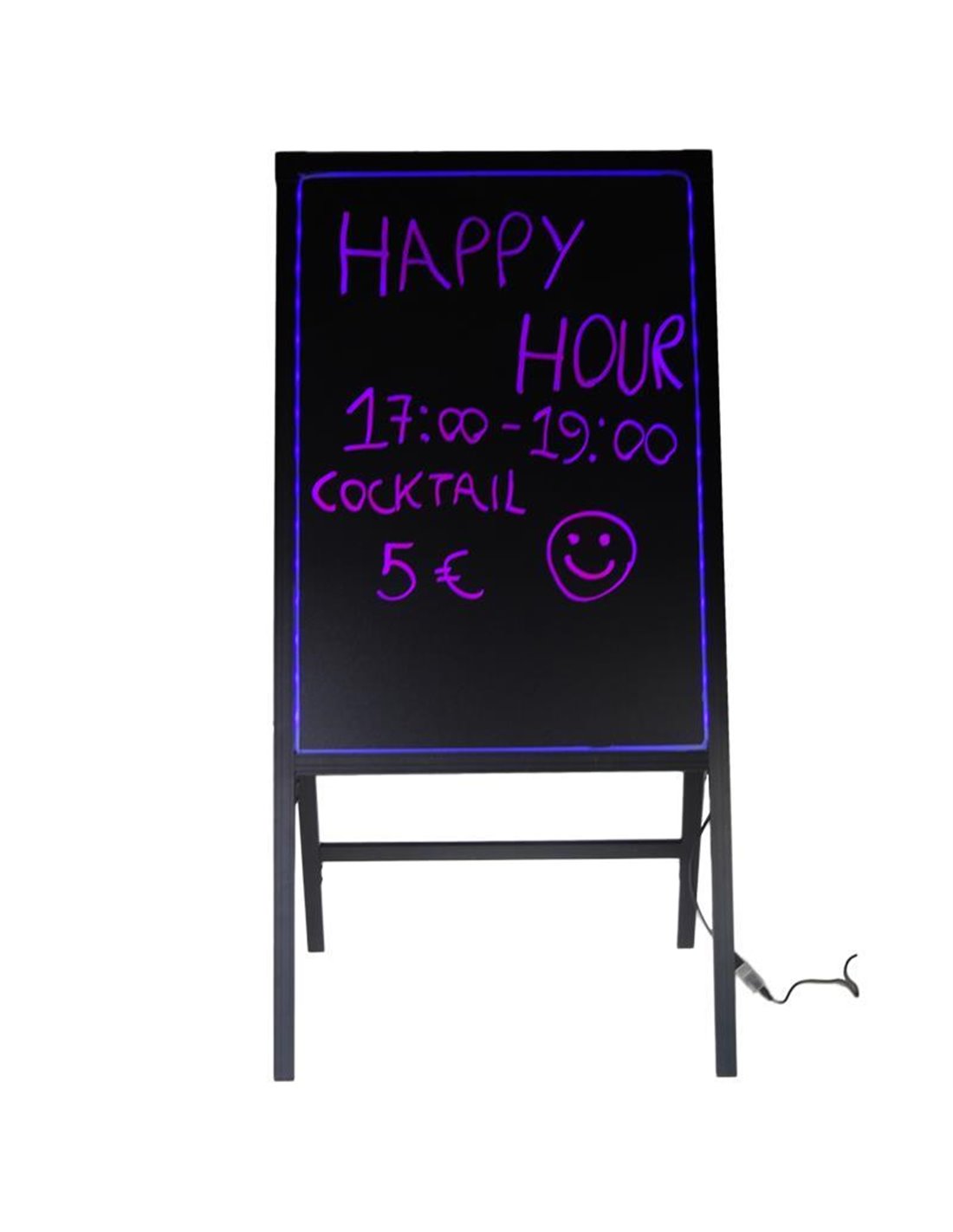 Πίνακας επιδαπέδιος led. Με κορνίζα αλουμινίου. Για το φωτισμό διαθέτει προγράμματα. Προσελκύει τα βλέμματα των περαστικών με τις εναλλαγές χρωμάτων. Κατάλληλος για καφέ, μπαρ, εστιατόρια κ.ά. Γράφετε με ειδικούς μαρκαδόρους υγρής κιμωλίας και σβήνετε με βρεγμένο πανί ή με καθαριστικό για τζάμια. Μέγιστη ισχύ 120-240V. Διαστάσεις πίνακα: 50x70εκ.