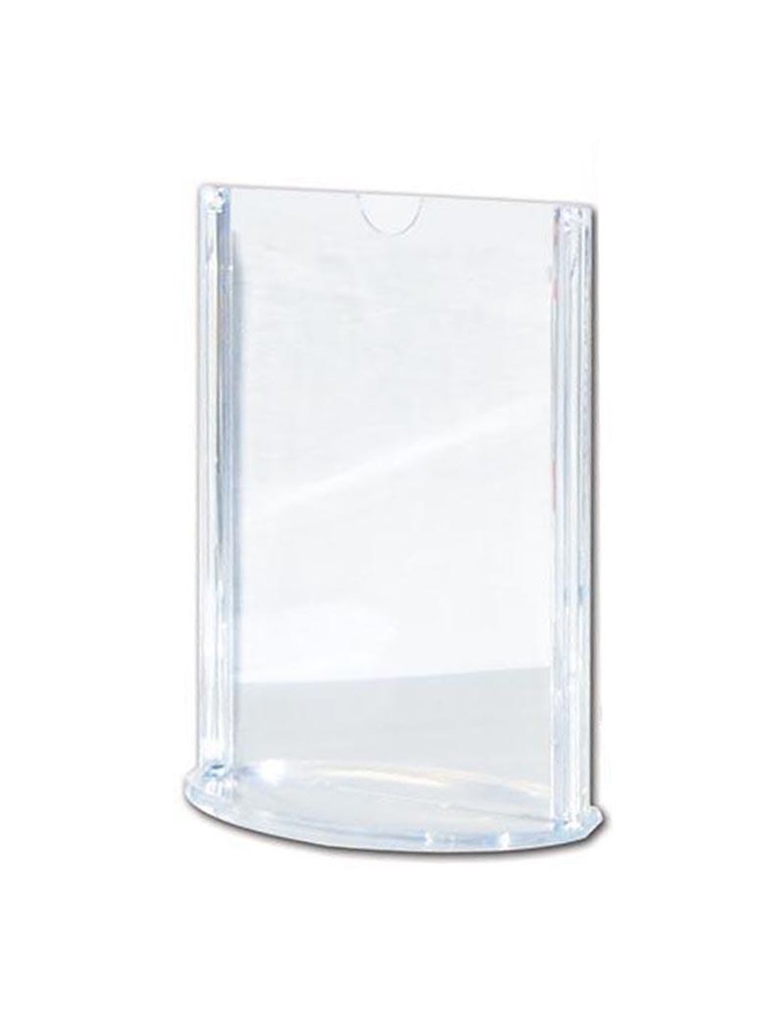 Σταντ ακρυλικό οβάλ κάθετο Α5. Οβάλ γωνίες με 2 εφαπτώμενες διαφανείς επιφάνειες που μέσα τοποθετούνται φύλλα. Κατάλληλο για διαφημιστικά έντυπα, περιγραφές προϊόντων, τιμές, μενού εστιατορίων κ.ά. Διαστάσεις: 15x7.2x21.5εκ.