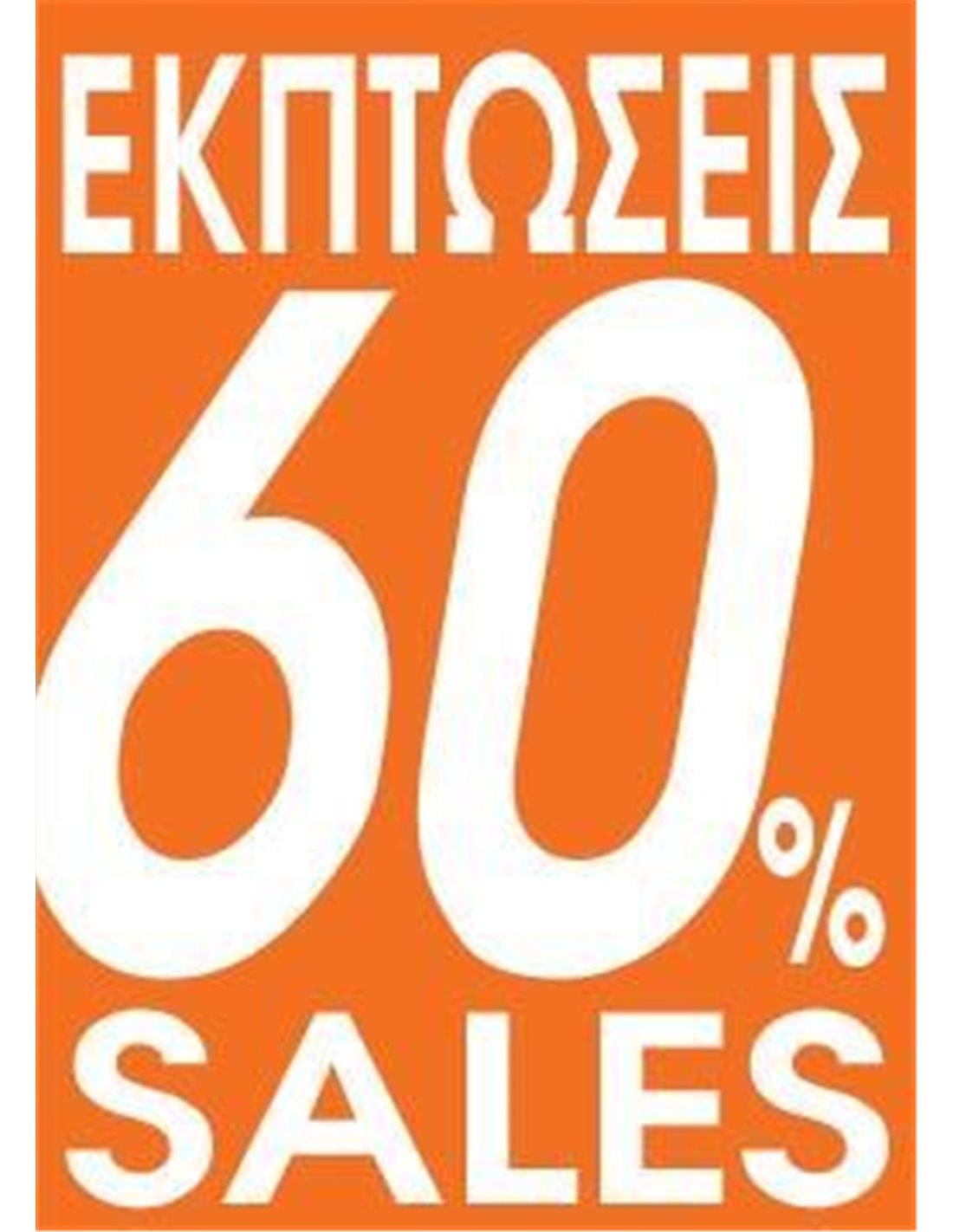 Αφίσα "Εκπτώσεις 60%". Κοκτέηλ 2 χρώματα. Φωσφορούχο πράσινο και πορτοκαλί. Κολλιούνται εσωτερικά στο τζάμι της βιτρίνας. Διαστάσεις: 35x50εκ.