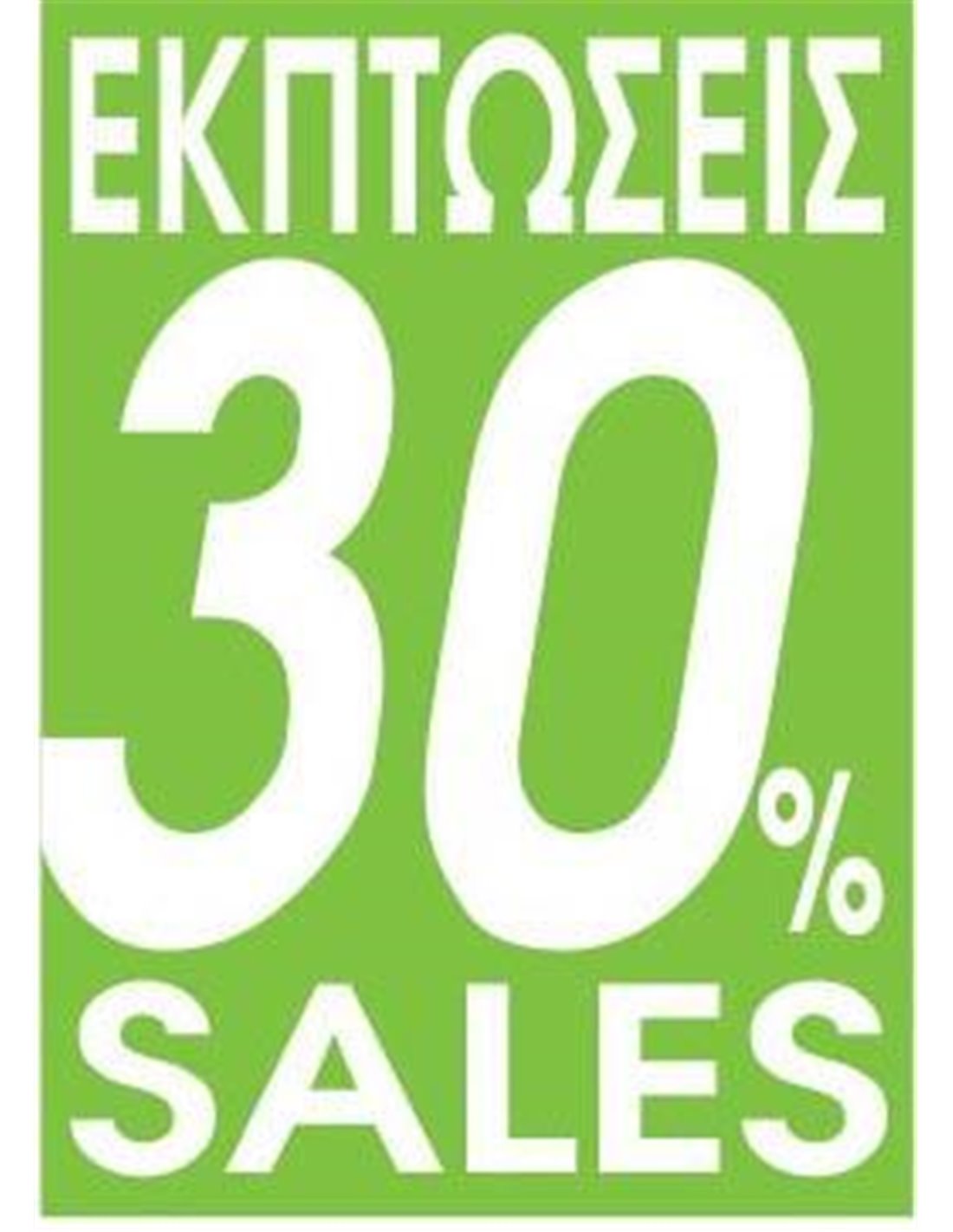 Αφίσα "Εκπτώσεις 30%". Κοκτέηλ 2 χρώματα. Φωσφορούχο πράσινο και πορτοκαλί. Κολλιούνται εσωτερικά στο τζάμι της βιτρίνας. Διαστάσεις: 35x50εκ.
