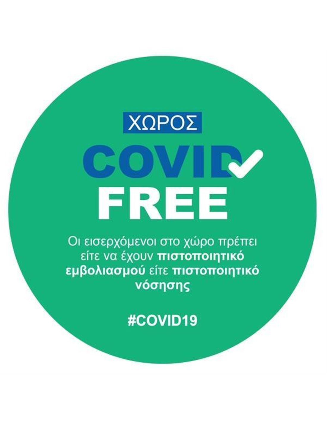 Next αυτοκόλλητο στρογγυλό "Χώρος covid free" διαμέτρου Ø16εκ. Για τη σήμανση των καταστημάτων εστίασης. Με ματ πλαστικοποίηση, για να μη φθείρεται.