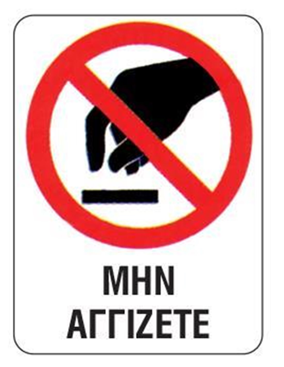 Πινακίδα pvc "Μην αγγίζετε". Κολλιέται σε λείες επιφάνειες. Δεν σκίζεται και δεν επηρεάζεται από το νερό. Εκτύπωση μεταξοτυπία για να μην ξεθωριάζει από τον ήλιο. Διαστάσεις: 15χ20εκ.