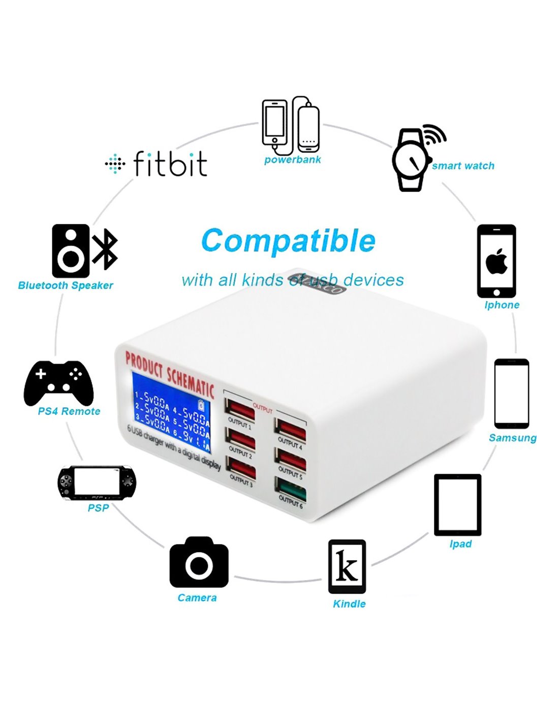 Οι θύρες του είναι τύπου USB και είναι συμβατός με όλες τις mobile συσκευές όπως smartphones, tablets, bluetooth συσκευές, MP4 κλπ. Συμπεριλαμβάνεται καλώδιο τροφοδοσίας.