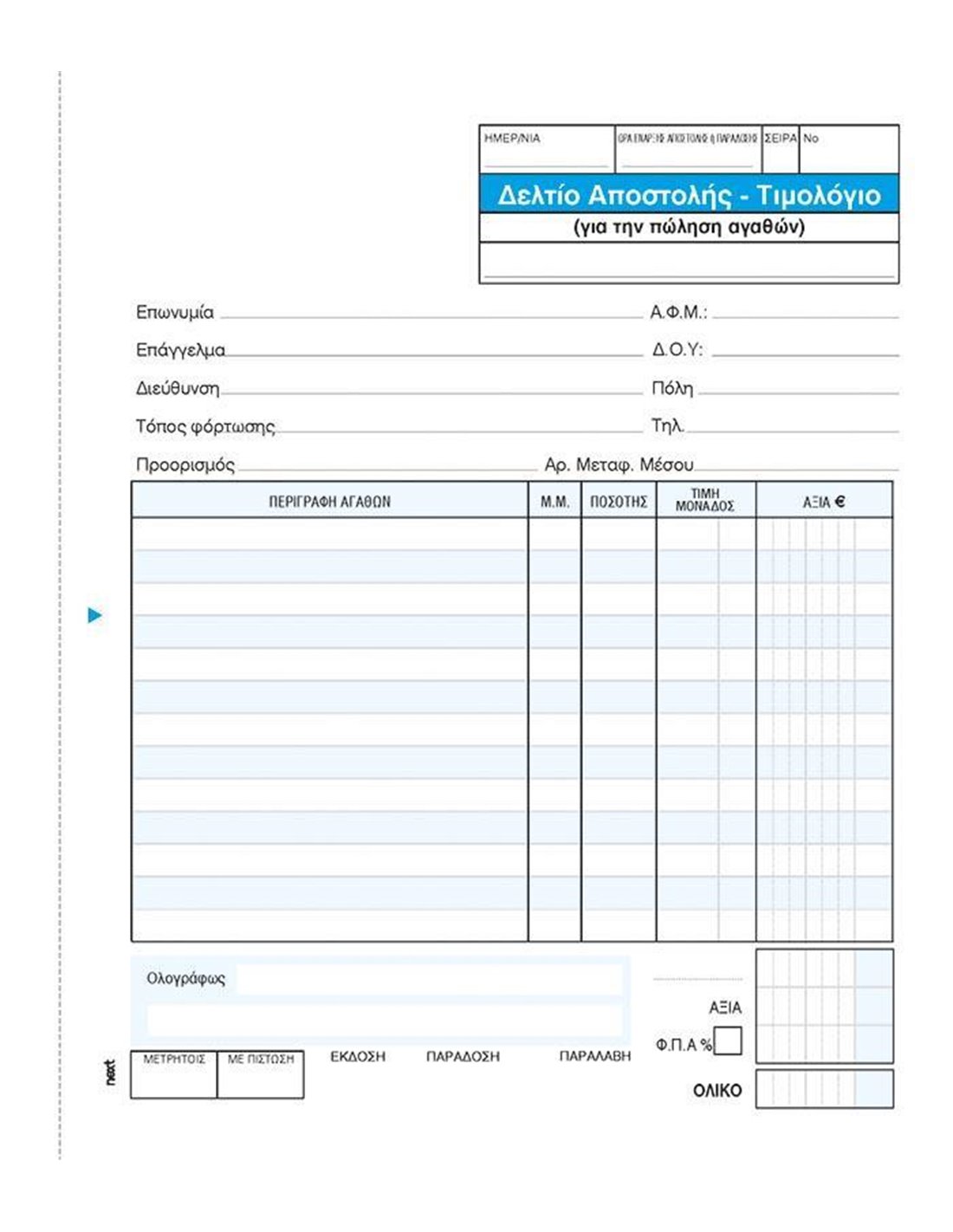 Δελτίο Αποστολής-Τιμολόγιο για πώληση αγαθών, διπλότυπο 2x50 φύλλα. Διαστάσεις: 17x20εκ.