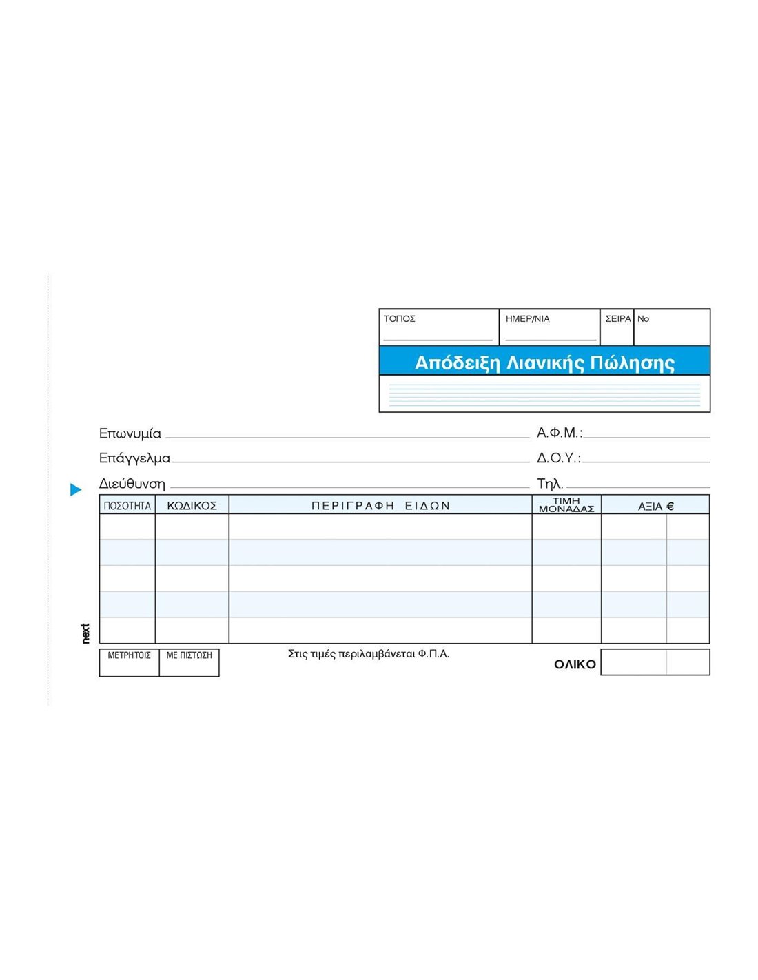 Απόδειξη λιανικής πώλησης, διπλότυπη 2x50 φύλλα. Διαστάσεις: 10x17εκ.