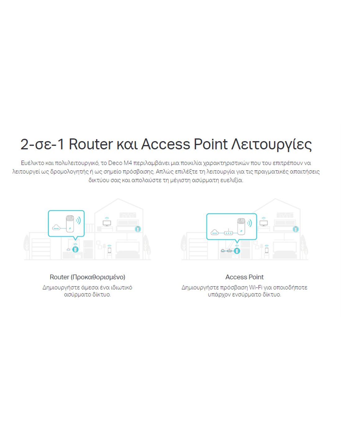 -Με την προηγμένη τεχνολογία Deco Mesh, οι μονάδες συνεργάζονται για να σχηματίσουν ένα ενοποιημένο δίκτυο με ένα μόνο όνομα δικτύου. Οι συσκευές αλλάζουν αυτόματα μεταξύ Decos καθώς μετακινείστε στο σπίτι σας για τις γρηγορότερες δυνατές ταχύτητες.