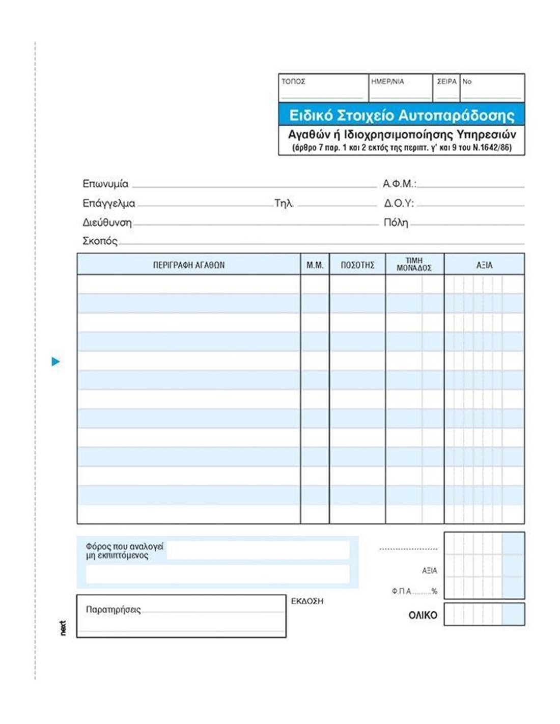 Ειδικό στοιχείο αυτοπαράδοσης, τριπλότυπο 3x50 φύλλα. Διαστάσεις: 17x20εκ.