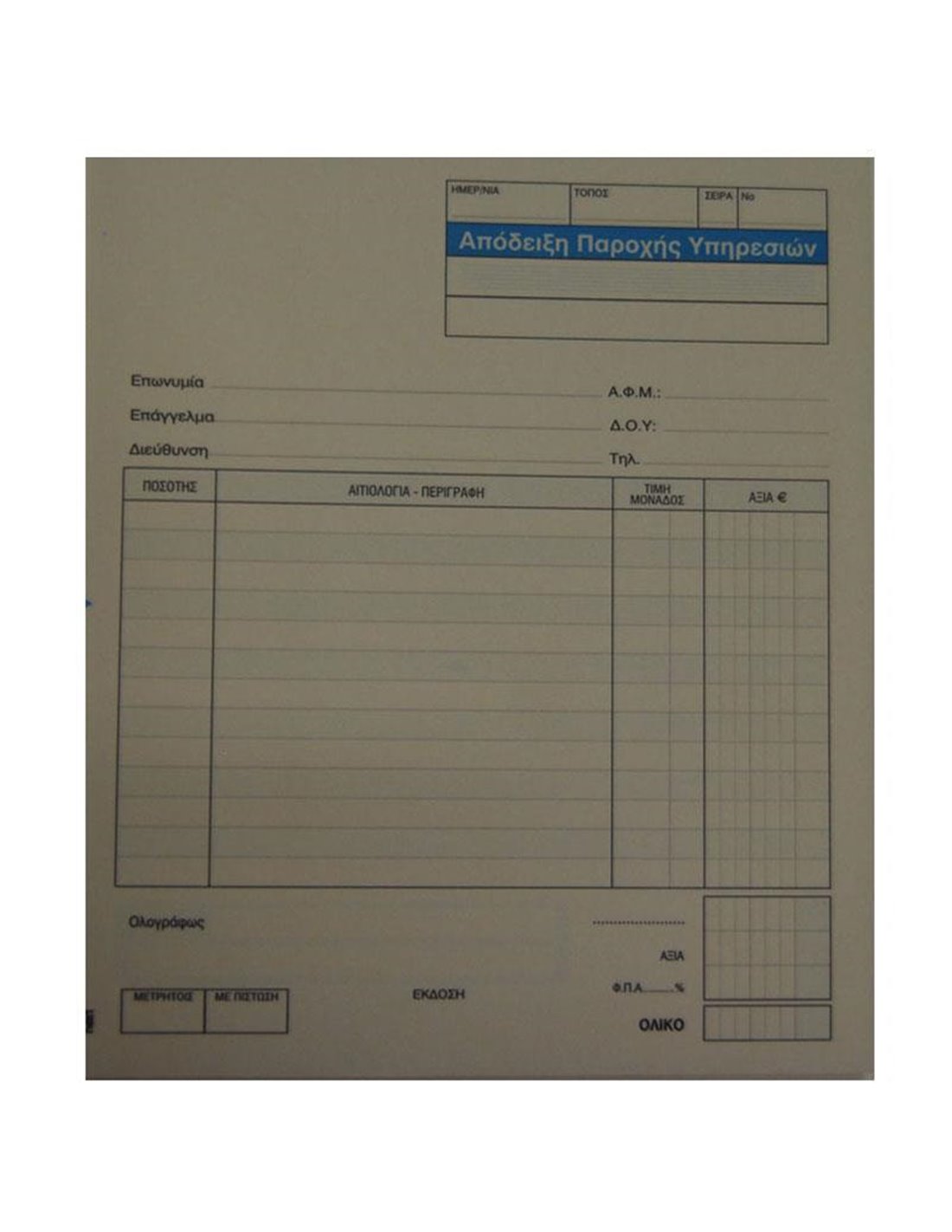 Απόδειξη παροχής υπηρεσιών, διπλότυπη 2x50 φύλλα. Διαστάσεις: 17x20εκ.