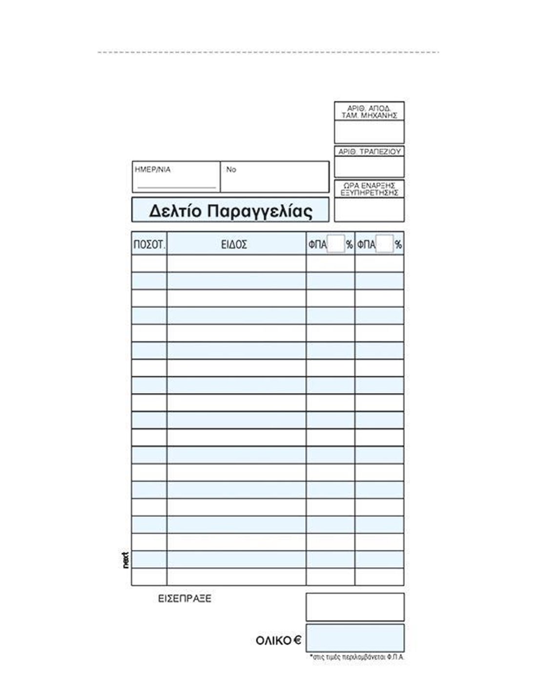 Δελτίο παραγγελίας εστιατορίων, διπλότυπο 2x50 φύλλα. Διαστάσεις: 8x17εκ.